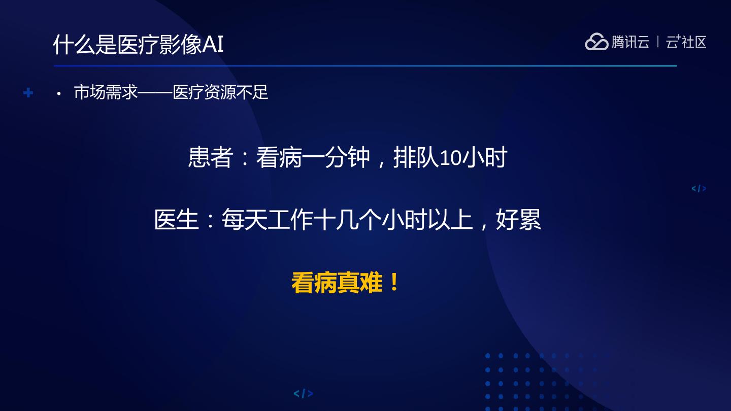 5 .什么是医疗影像AI • 市场需求——医疗资源不足 患者:看病一分钟,排队10小时 医生:每天工作十几个小时以上,好累 看病真难!
