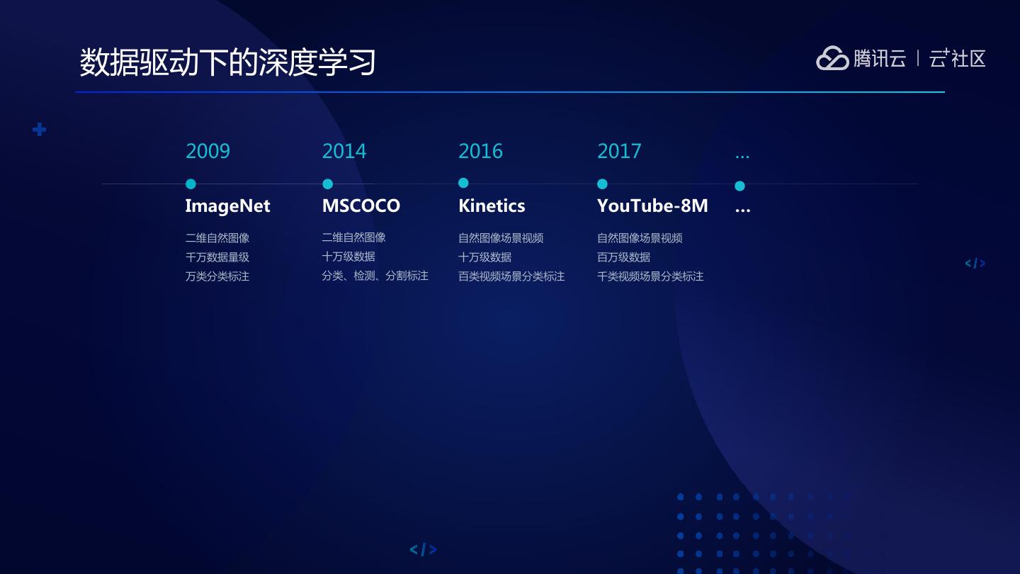 10 .数据驱动下的深度学习 2009 2014 2016 2017 … ImageNet MSCOCO Kinetics YouTube-8M … 二维自然图像 二维自然图像 自然图像场景视频 自然图像场景视频 千万数据量级 十万级数据 十万级数据 百万级数据 万类分类标注 分类、检测、分割标注 百类视频场景分类标注 千类视频场景分类标注
