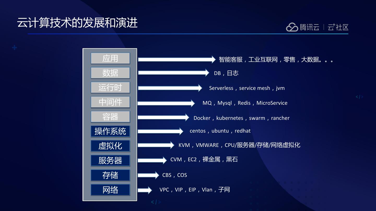 9 .云计算技术的发展和演进 应用 智能客服,工业互联网,零售,大数据。。。 数据 DB,日志 运行时 Serverless,service mesh,jvm 中间件 MQ,Mysql,Redis,MicroService 容器 Docker,kubernetes,swarm,rancher 操作系统 centos,ubuntu,redhat 虚拟化 KVM,VMWARE,CPU/服务器/存储/网络虚拟化 服务器 CVM,EC2,裸金属,黑石 存储 CBS,COS 网络 VPC,VIP,EIP,Vlan,子网