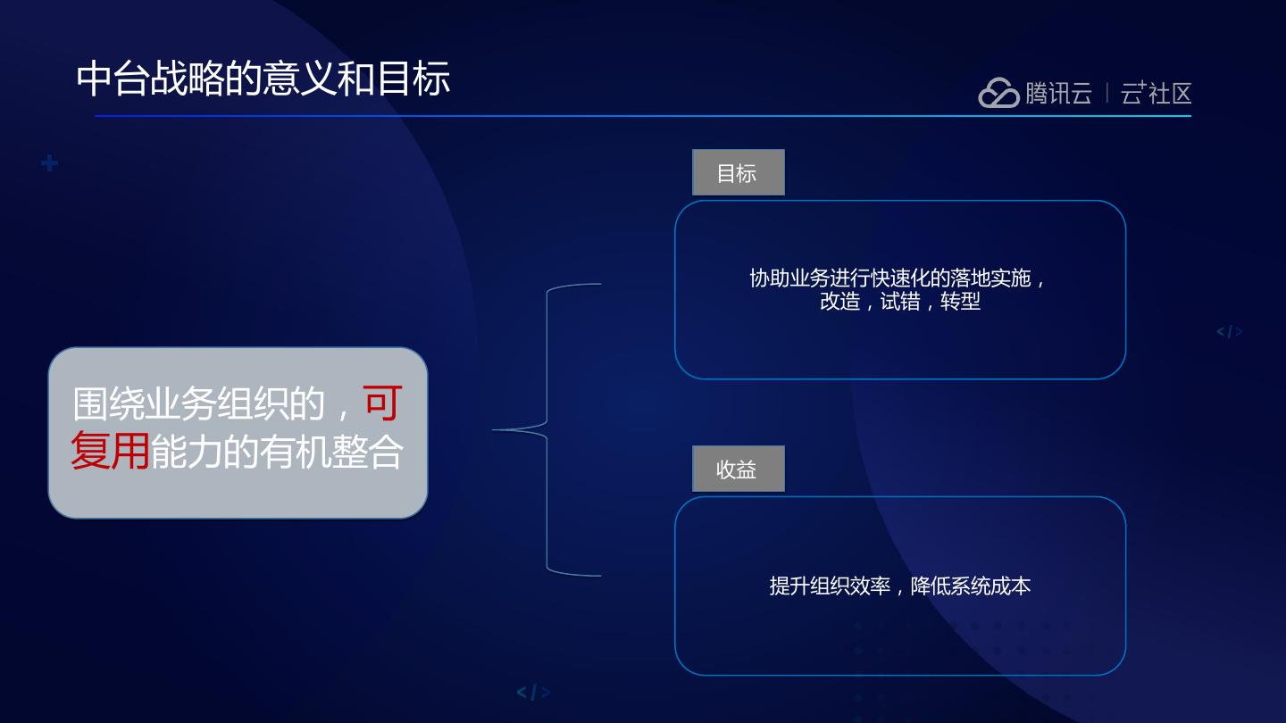 17 .中台战略的意义和目标 目标 协助业务进行快速化的落地实施, 改造,试错,转型 围绕业务组织的,可 复用能力的有机整合 收益 提升组织效率,降低系统成本