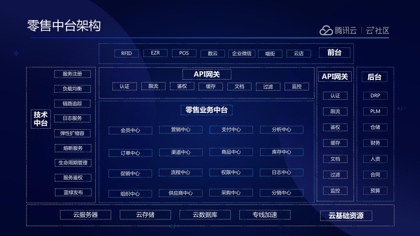 19 .零售中台架构 RFID EZR POS 数云 企业微信 喵街 云店 前台 服务注册 API网关 API网关 后台 认证 限流 鉴权 缓存 文档 过滤 监控 负载均衡 认证 DRP 链路追踪 零售业务中台 限流 PLM 技术 日志服务 中台 鉴权 仓储 会员中心 营销中心 支付中心 分析中心 弹性扩缩容 缓存 财务 熔断服务 订单中心 渠道中心 商品中心 库存中心 文档 人资 生命周期管理 促销中心 流程中心 权限中心 日志中心 过滤 合同 服务鉴权 蓝绿发布 采购中心 分销中心 监控 预算 组织中心 供应商中心 云服务器 云存储 云数据库 专线加速 云基础资源