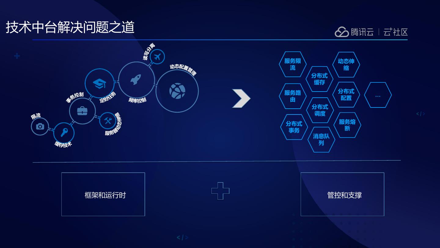 20 .技术中台解决问题之道 服务限 动态伸 流 缩 分布式 缓存 服务路 分布式 … 由 配置 分布式 调度 分布式 服务熔 事务 断 消息队 列 框架和运行时 管控和支撑