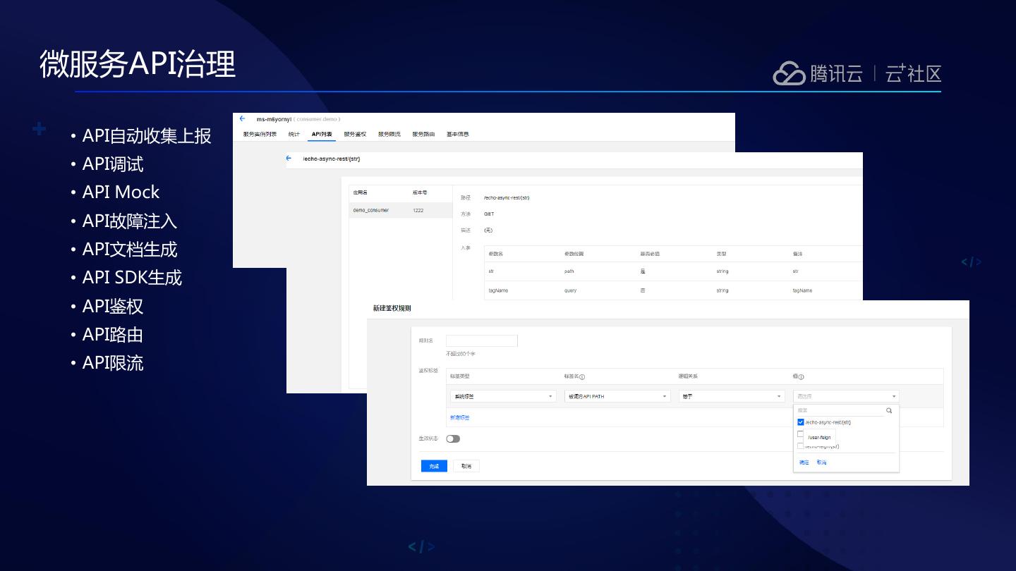 27 . 微服务治理 服务鉴权 服务路由 服务限流 服务容错 服务熔断 服务降级 鉴权模式: 路由模式: 限流粒度: 容错级别: 隔离级别: 降级维度: • 白名单(允许调用) • 权重路由 • 全局限流 • FailOver • 服务隔离 • Api维度 • 黑名单(拒绝调用) • FailFast • 标签路由 • 标签限流 • 实例隔离 • 标签维度 • Failback • 接口隔离 场景举例: • Forking 场景举例: 场景举例: 场景举例: 位置数据服务仅允许用户 ⚫ 灰度发布功能 核心服务设置全局限流,限 场景举例: 针对不同的api设置不同的降 ID=1010的用户访问,开发者可 场景举例: 以设置鉴权白名单,自定义标签 ⚫ 多机房路由优先调用同地 流阈值为1秒钟10万次调 可以针对某服务配置熔断时 级等级,当服务到达降级阀 可以分别针对于重要api和不 用户ID=1010。 机房; 用。 候进行api隔离,当某api失 值(处理能力),会优先放通 重要api的请求设置FailOver ⚫ 部分用户账号内测功能; 败率比较高的时候,只熔断 高优先级的api,拒绝优先级 和FailFast策略,在处理能力 ⚫ 保障重要服务的运行质 掉对应的api,不影响其他 低的api。 恒定情况下,尽量保证业务 量、实现前后端分离、读 的可用性。 api的调用。 写分离等功能;