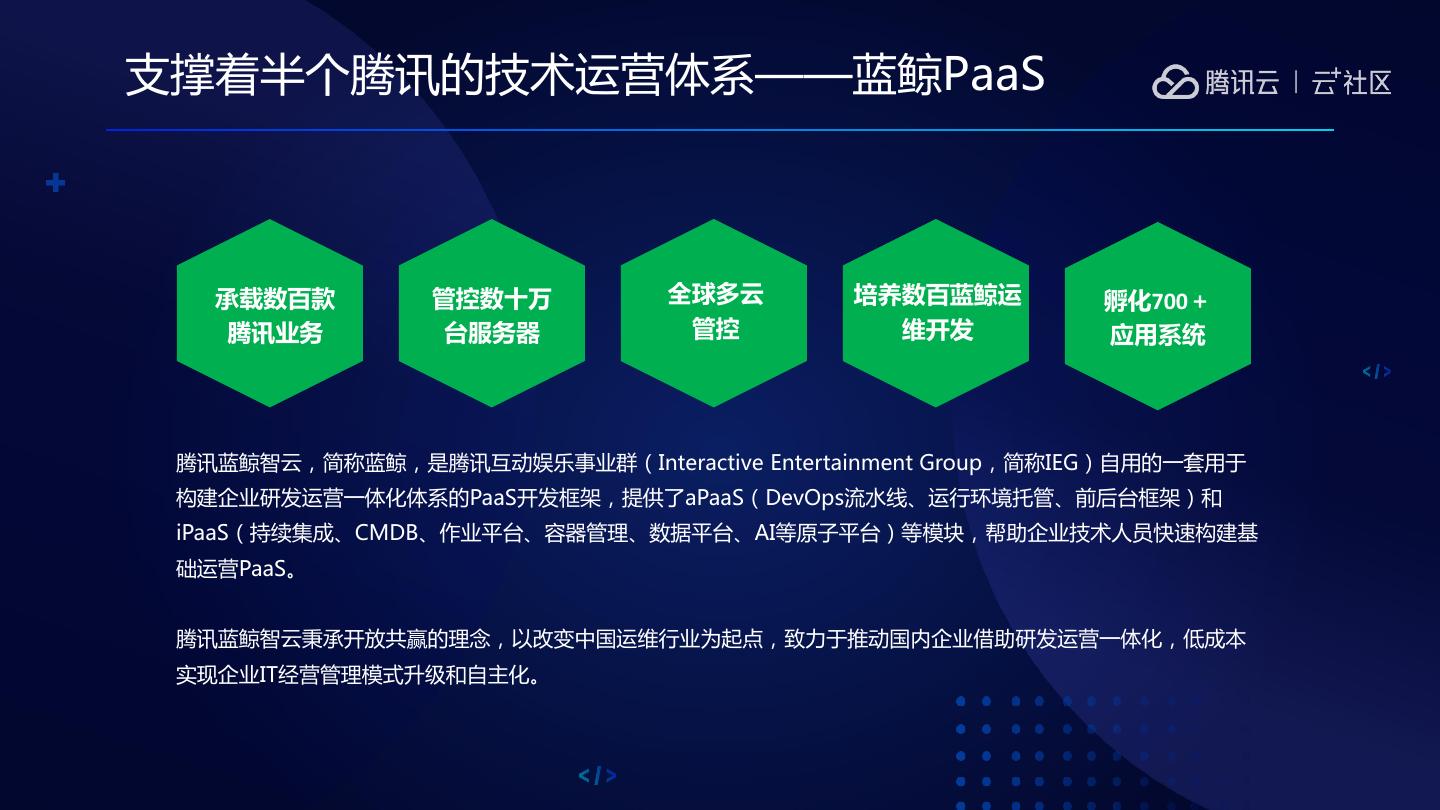 2 .支撑着半个腾讯的技术运营体系——蓝鲸PaaS 承载数百款 管控数十万 全球多云 培养数百蓝鲸运 孵化700+ 腾讯业务 台服务器 管控 维开发 应用系统 腾讯蓝鲸智云,简称蓝鲸,是腾讯互动娱乐事业群(Interactive Entertainment Group,简称IEG)自用的一套用于 构建企业研发运营一体化体系的PaaS开发框架,提供了aPaaS(DevOps流水线、运行环境托管、前后台框架)和 iPaaS(持续集成、CMDB、作业平台、容器管理、数据平台、AI等原子平台)等模块,帮助企业技术人员快速构建基 础运营PaaS。 腾讯蓝鲸智云秉承开放共赢的理念,以改变中国运维行业为起点,致力于推动国内企业借助研发运营一体化,低成本 实现企业IT经营管理模式升级和自主化。