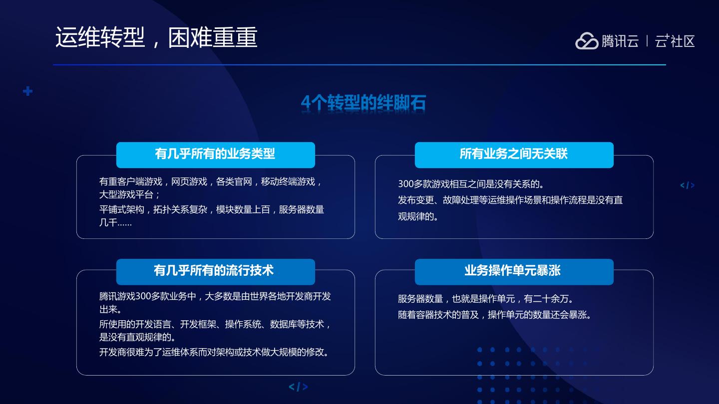 4 .运维转型,困难重重 4个转型的绊脚石 有几乎所有的业务类型 所有业务之间无关联 有重客户端游戏,网页游戏,各类官网,移动终端游戏, 300多款游戏相互之间是没有关系的。 大型游戏平台; 发布变更、故障处理等运维操作场景和操作流程是没有直 平铺式架构,拓扑关系复杂,模块数量上百,服务器数量 观规律的。 几千…… 有几乎所有的流行技术 业务操作单元暴涨 腾讯游戏300多款业务中,大多数是由世界各地开发商开发 服务器数量,也就是操作单元,有二十余万。 出来。 随着容器技术的普及,操作单元的数量还会暴涨。 所使用的开发语言、开发框架、操作系统、数据库等技术, 是没有直观规律的。 开发商很难为了运维体系而对架构或技术做大规模的修改。