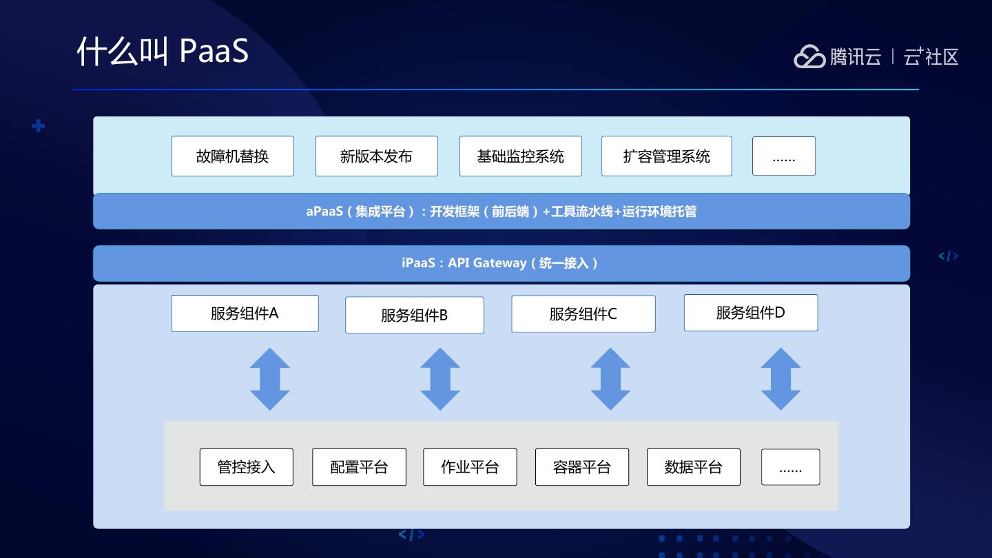 7 .什么叫 PaaS 故障机替换 新版本发布 基础监控系统 扩容管理系统 …… aPaaS(集成平台):开发框架(前后端)+工具流水线+运行环境托管 iPaaS:API Gateway(统一接入) 服务组件A 服务组件B 服务组件C 服务组件D 管控接入 原子A 配置平台 原子B 作业平台 原子C 容器平台 原子D 数据平台 原子E ……