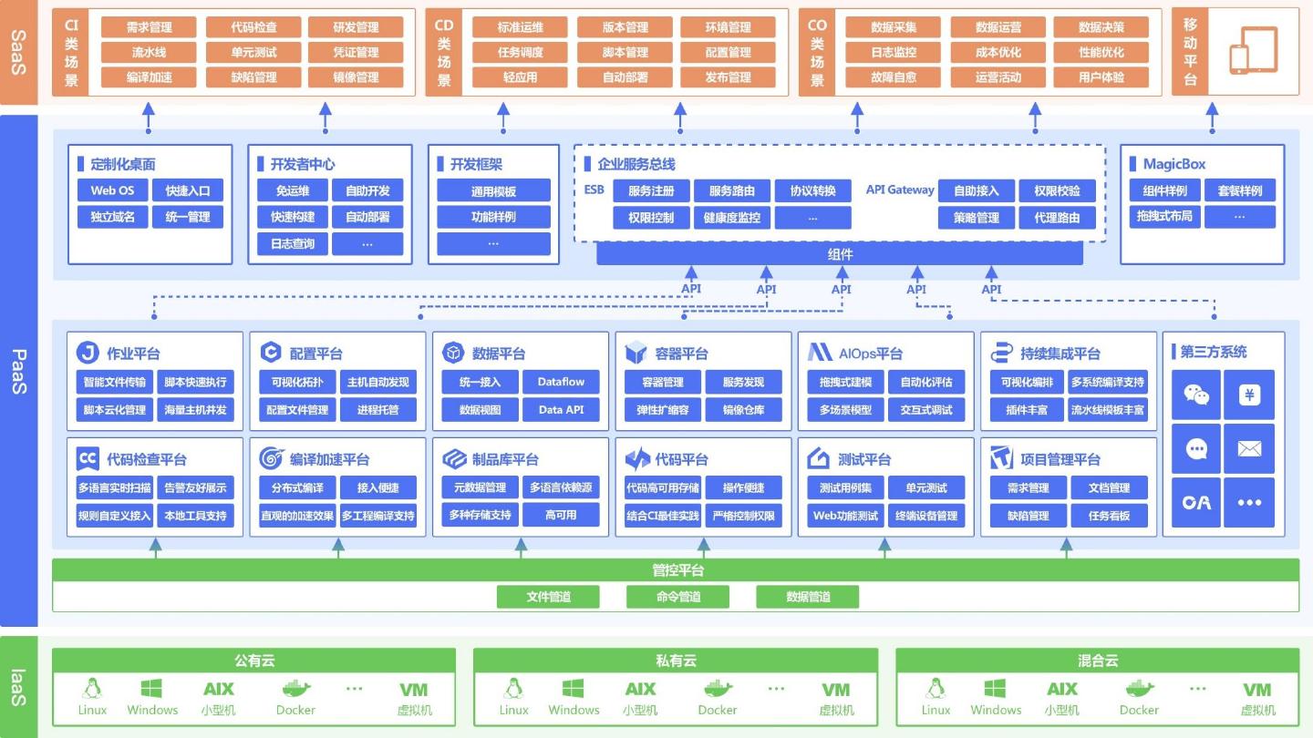 从烟囱治理到PaaS技术框架,到组织转型,再到企业工具文化,基于PaaS框架,实现CI/CD/CO的研发、运维、运营全覆盖。而蓝鲸就是这样一个实现企业研发运营一体化体系的 PaaS 开发框架,它提供了 aPaaS(DevOps流水线、运行环境托管、前后台框架)和 iPaaS(持续集成、CMDB、作业平台、容器管理、数据平台、AI等原子平台)等模块,帮助企业技术人员快速构建基础运营PaaS。
