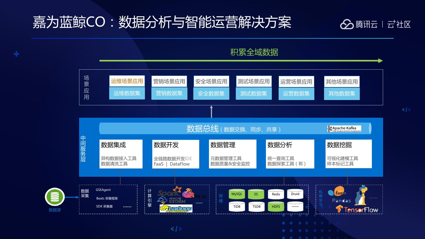 16 .嘉为蓝鲸CO:数据分析与智能运营解决方案 积累全域数据 场 运维场景应用 营销场景应用 安全场景应用 测试场景应用 运营场景应用 其他场景应用 景 应 运维数据集 营销数据集 安全数据集 测试数据集 运营数据集 其他数据集 用 数据总线(数据交换、同步、共享) 中 间 数据集成 数据开发 数据管理 数据分析 数据挖掘 服 务 层 异构数据接入工具 全链路数据开发IDE 元数据管理工具 统一查询工具 可视化建模工具 数据清洗工具 FaaS | DataFlow 数据质量&安全监控 数据探索工具(BI) 样本标记工具 数据 GSEAgent 计 机 MySQL ES Redis Druid 采集 算 存 器 …… Beats 采集框架 引 …… 储 学 SDK 采集器 …… 擎 …… 习 TiDB TSDB HDFS 数据源