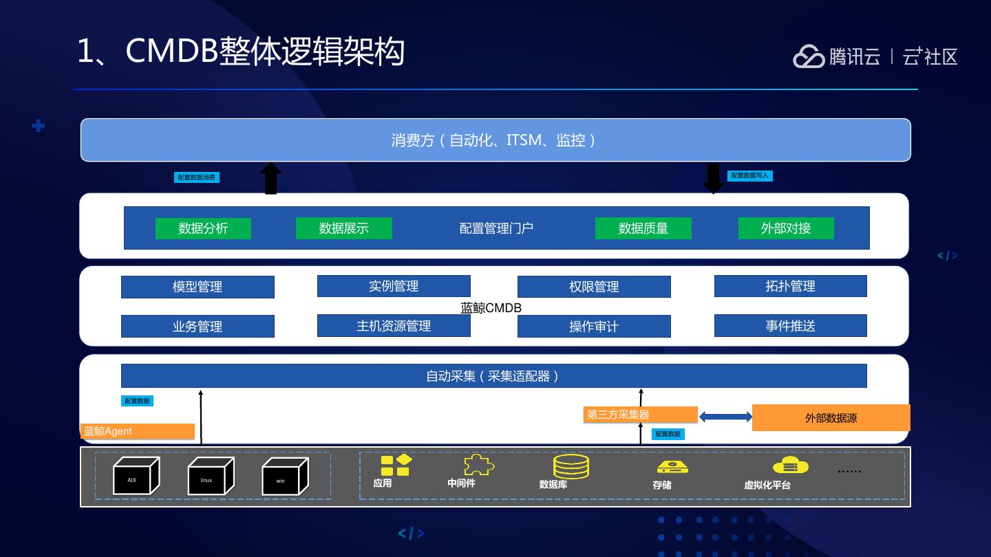 19 .1、CMDB整体逻辑架构 消费方(自动化、ITSM、监控) 配置数据消费 配置数据写入 数据分析 数据展示 配置管理门户 数据质量 外部对接 模型管理 实例管理 权限管理 拓扑管理 蓝鲸CMDB 业务管理 主机资源管理 操作审计 事件推送 自动采集(采集适配器) 配置数据 第三方采集器 外部数据源 蓝鲸Agent 配置数据 …… AIX linux win 应用 中间件 数据库 存储 虚拟化平台