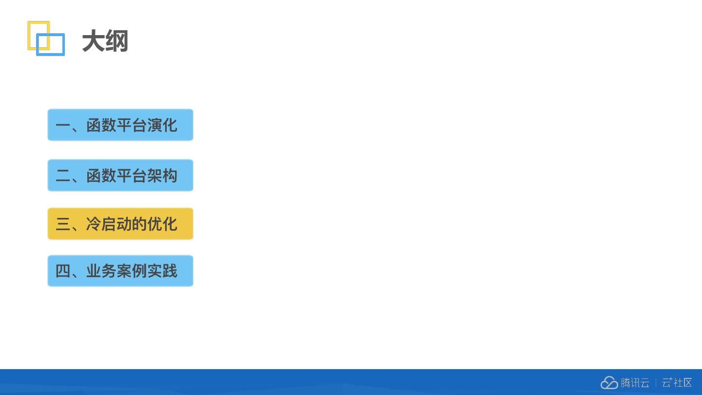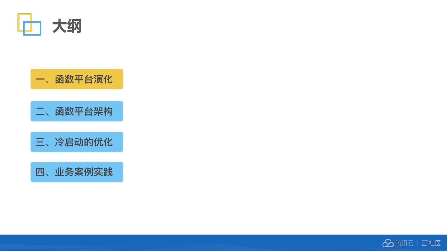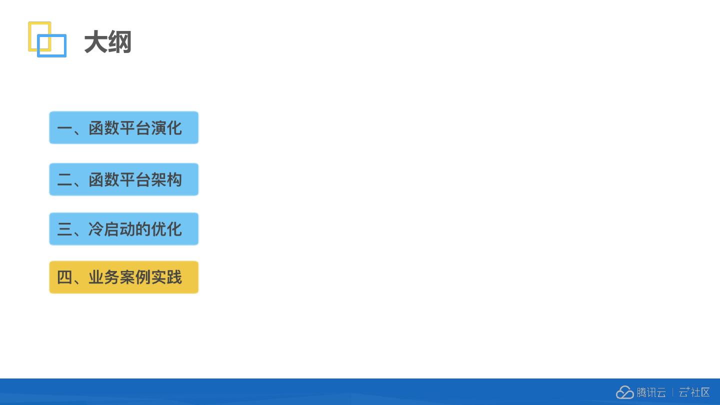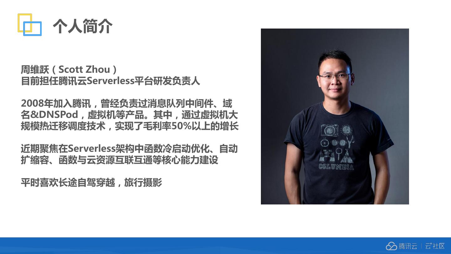 3 . 个人简介 周维跃(Scott Zhou) 目前担任腾讯云Serverless平台研发负责人 2008年加入腾讯,曾经负责过消息队列中间件、域 名&DNSPod,虚拟机等产品。其中,通过虚拟机大 规模热迁移调度技术,实现了毛利率50%以上的增长 近期聚焦在Serverless架构中函数冷启动优化、自动 扩缩容、函数与云资源互联互通等核心能力建设 平时喜欢长途自驾穿越,旅行摄影