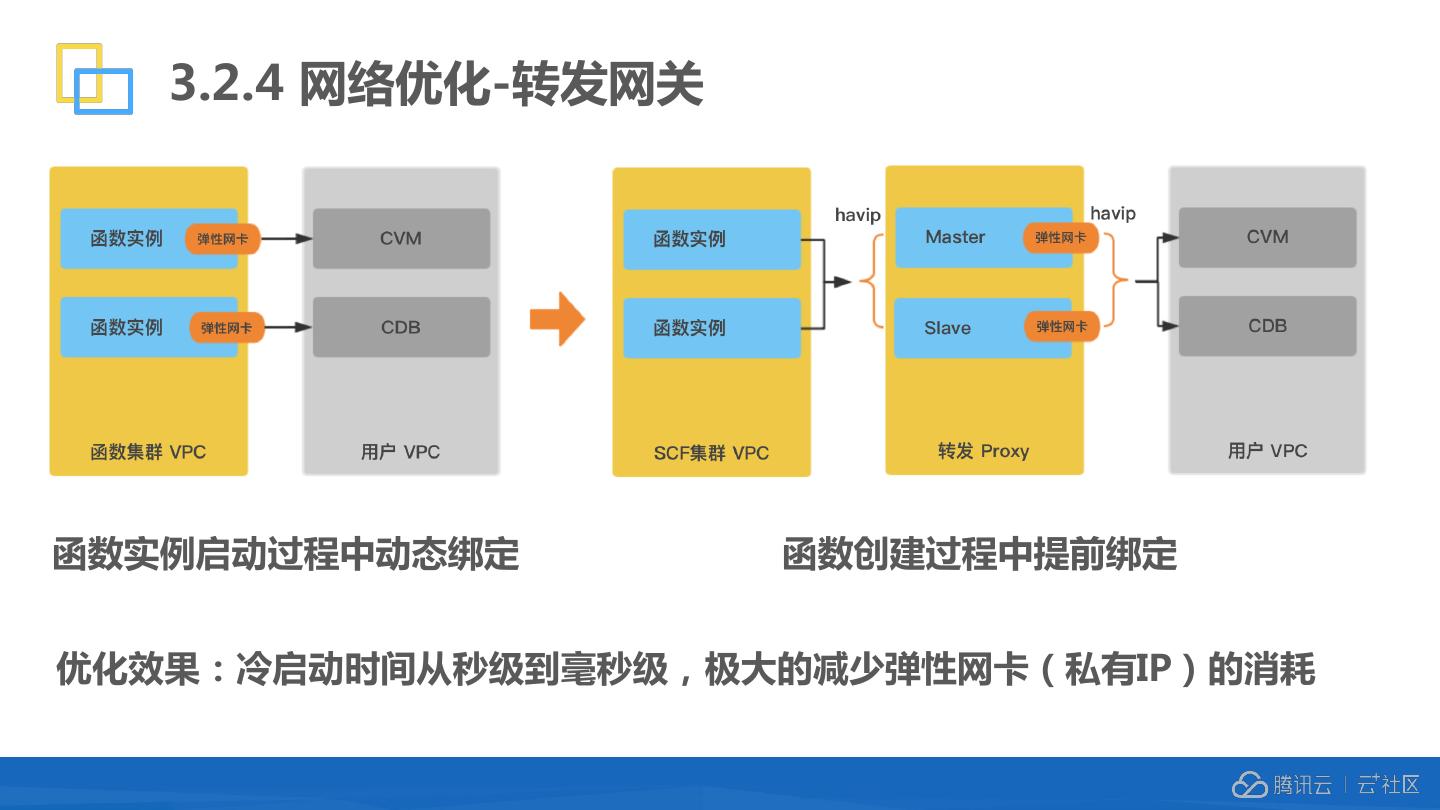 20 . 3.2.4 网络优化-转发网关 函数实例启动过程中动态绑定 函数创建过程中提前绑定 优化效果:冷启动时间从秒级到毫秒级,极大的减少弹性网卡(私有IP)的消耗