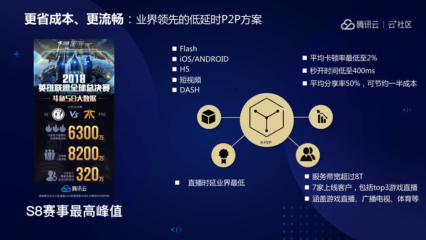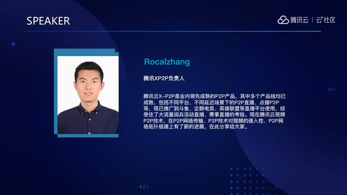 3 .SPEAKER Rocalzhang 腾讯XP2P负责⼈人 腾讯云X-P2P是业内领先成熟的P2P产品,其中多个产品线均已 成熟,包括不不同平台、不不同延迟场景下的P2P直播、点播P2P 等,现已推⼴广到⽃斗⻥鱼、企鹅电竞、英雄联盟等直播平台使⽤用,经 受住了了⼤大流量量阅兵活动直播、赛事直播的考验。现在腾讯云视频 P2P技术,在P2P⽹网络传输、P2P技术对视频的侵⼊入性、P2P⽹网 络拓拓扑组建上有了了新的进展,在此分享给⼤大家。