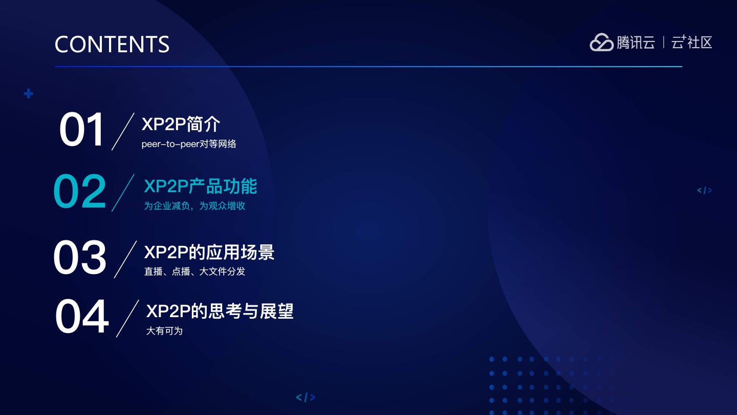 24 .CONTENTS 01 XP2P简介 peer-to-peer对等⽹网络 02 XP2P产品功能 为企业减负,为观众增收 03 XP2P的应⽤用场景 直播、点播、⼤大⽂文件分发 04 XP2P的思考与展望 ⼤大有可为