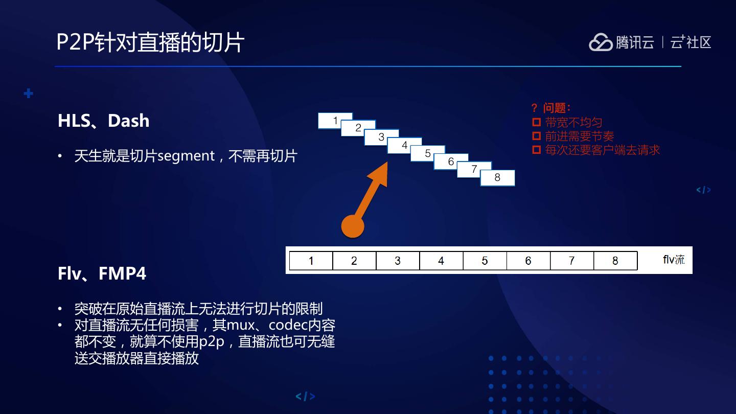 11 .P2P针对直播的切片 ?问题: HLS、Dash 1 2 p 带宽不均匀 3 p 前进需要节奏 4 p 每次还要客户端去请求 • 天生就是切片segment,不需再切片 5 6 7 8 Flv、FMP4 • 突破在原始直播流上无法进行切片的限制 • 对直播流无任何损害,其mux、codec内容 都不变,就算不使用p2p,直播流也可无缝 送交播放器直接播放