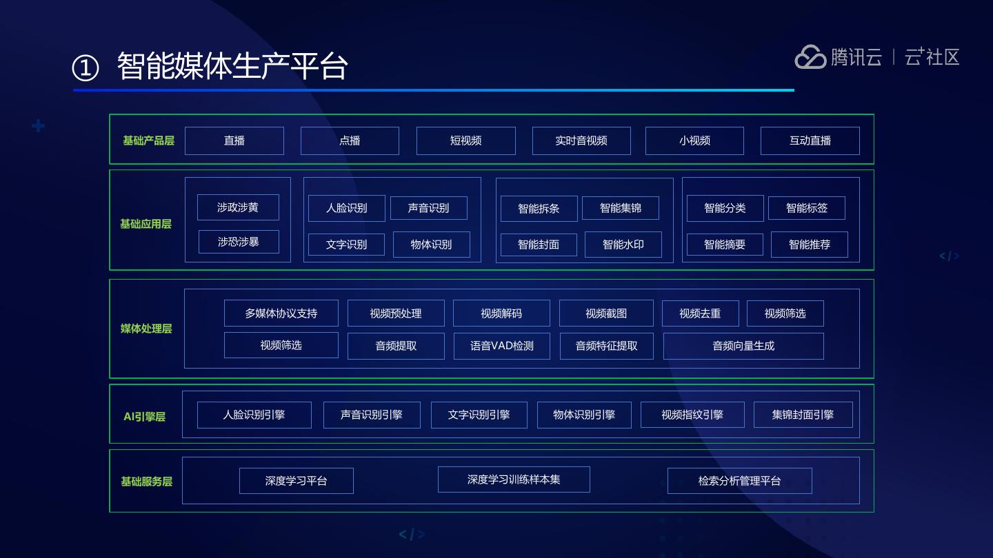11 .① 智能媒体生产平台 基础产品层 直播 点播 短视频 实时音视频 小视频 互动直播 涉政涉黄 人脸识别 声音识别 智能拆条 智能集锦 智能分类 智能标签 基础应用层 涉恐涉暴 文字识别 物体识别 智能封面 智能水印 智能摘要 智能推荐 多媒体协议支持 视频预处理 视频解码 视频截图 视频去重 视频筛选 媒体处理层 视频筛选 音频提取 语音VAD检测 音频特征提取 音频向量生成 AI引擎层 人脸识别引擎 声音识别引擎 文字识别引擎 物体识别引擎 视频指纹引擎 集锦封面引擎 基础服务层 深度学习平台 深度学习训练样本集 检索分析管理平台