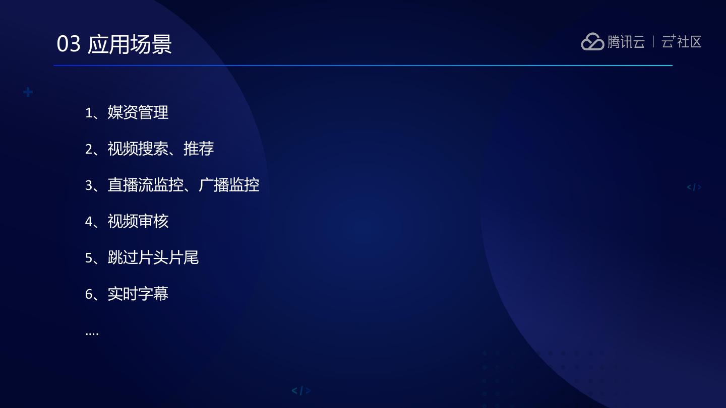 21 .03 应用场景 1、媒资管理 2、视频搜索、推荐 3、直播流监控、广播监控 4、视频审核 5、跳过片头片尾 6、实时字幕 ….