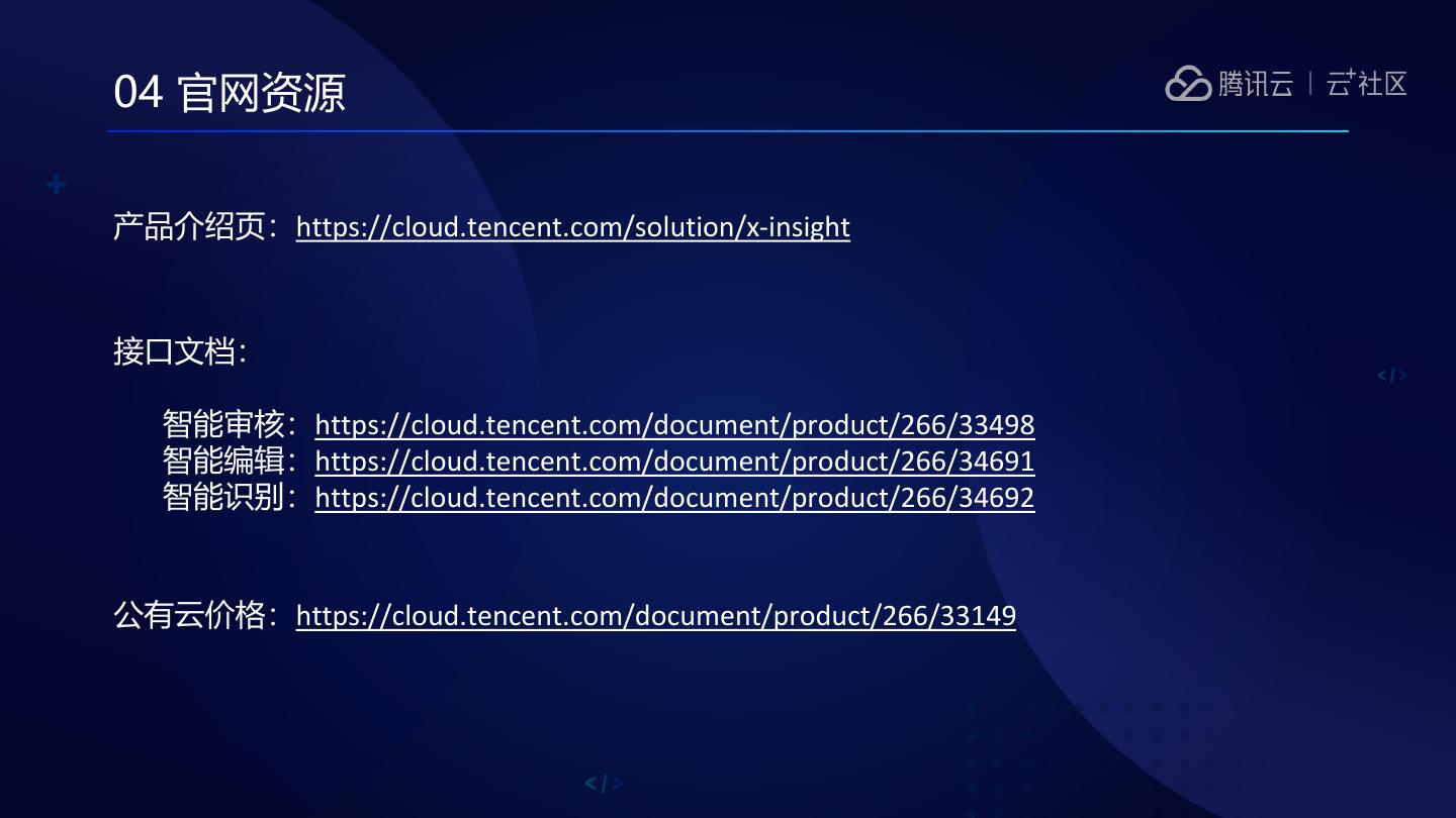 22 .04 官网资源 产品介绍页:https://cloud.tencent.com/solution/x-insight 接口文档: 智能审核:https://cloud.tencent.com/document/product/266/33498 智能编辑:https://cloud.tencent.com/document/product/266/34691 智能识别:https://cloud.tencent.com/document/product/266/34692 公有云价格:https://cloud.tencent.com/document/product/266/33149