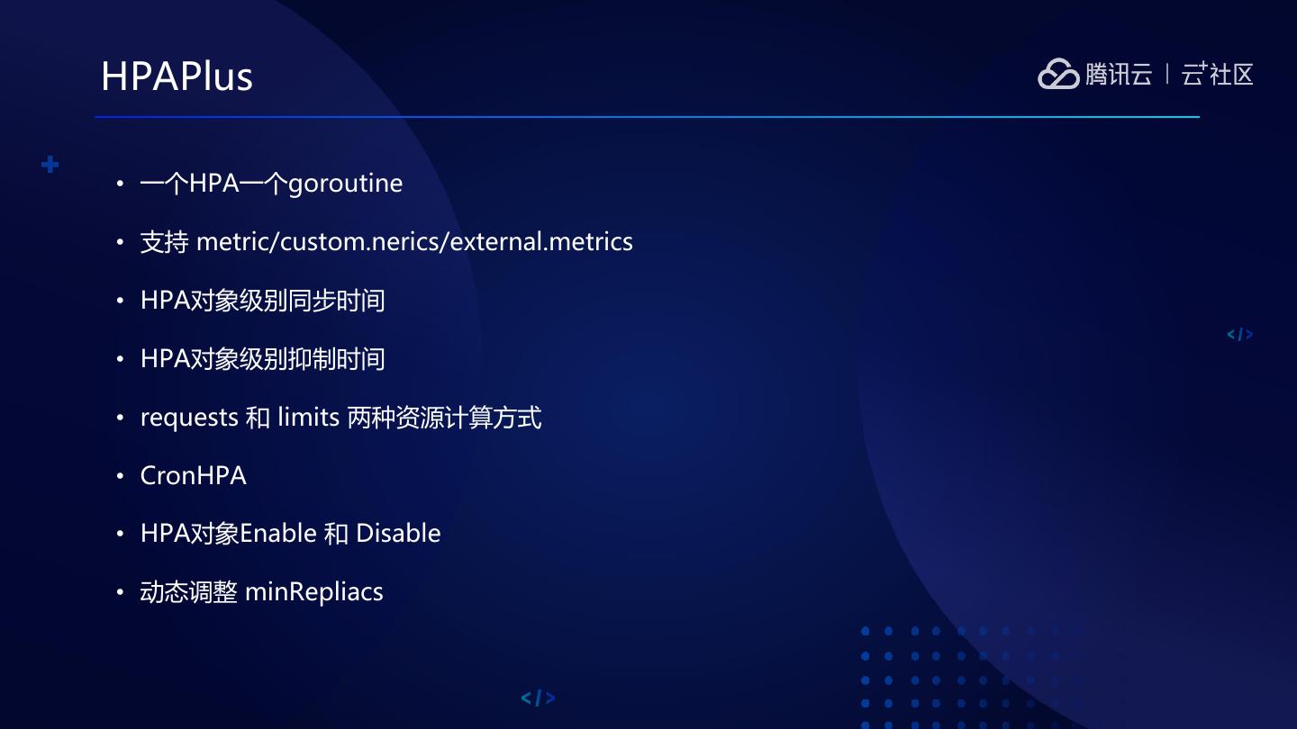 8 .HPAPlus • 一个HPA一个goroutine • 支持 metric/custom.nerics/external.metrics • HPA对象级别同步时间 • HPA对象级别抑制时间 • requests 和 limits 两种资源计算方式 • CronHPA • HPA对象Enable 和 Disable • 动态调整 minRepliacs