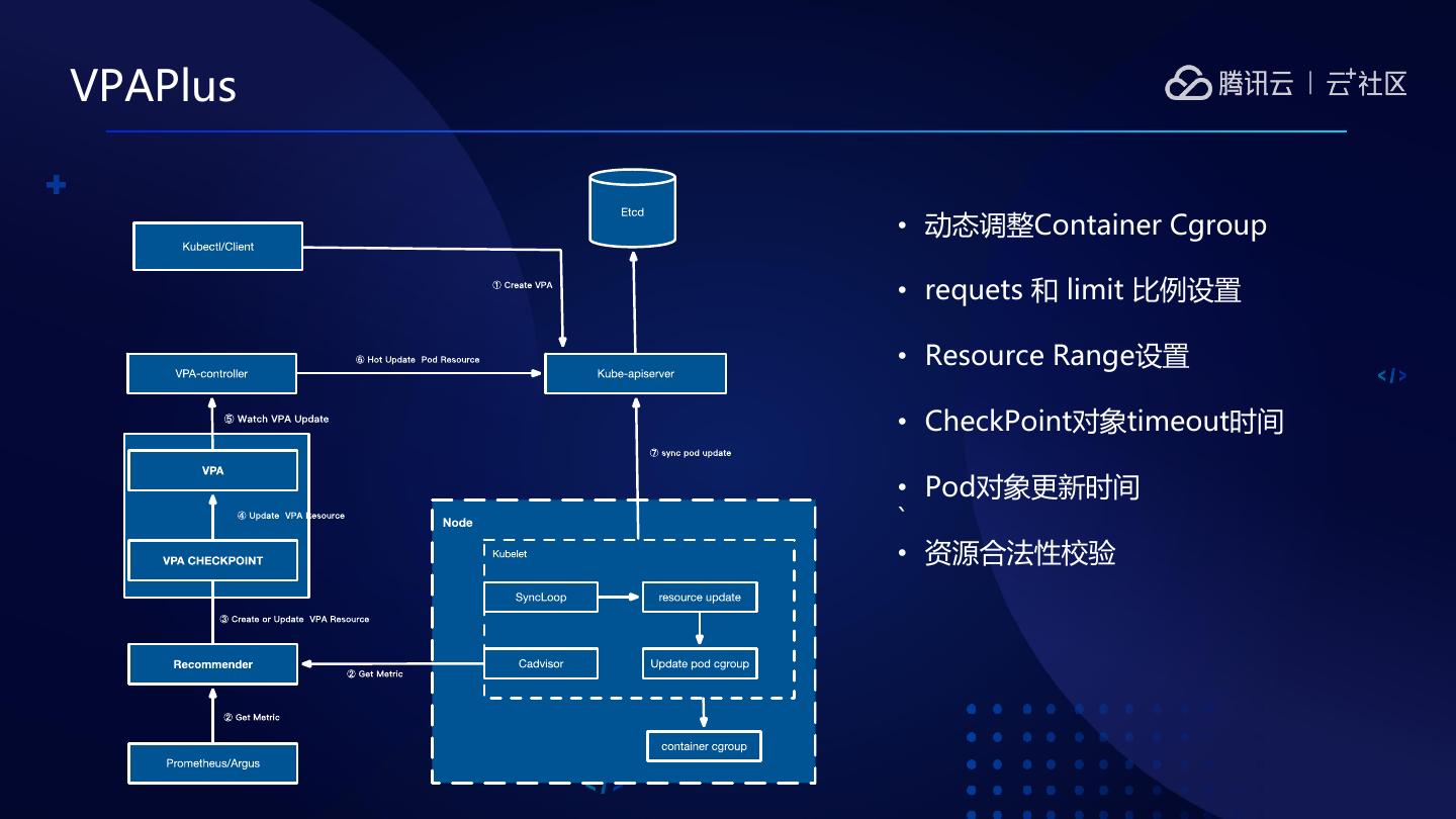 9 .VPAPlus • 动态调整Container Cgroup • requets 和 limit 比例设置 • Resource Range设置 • CheckPoint对象timeout时间 • Pod对象更新时间 ` • 资源合法性校验