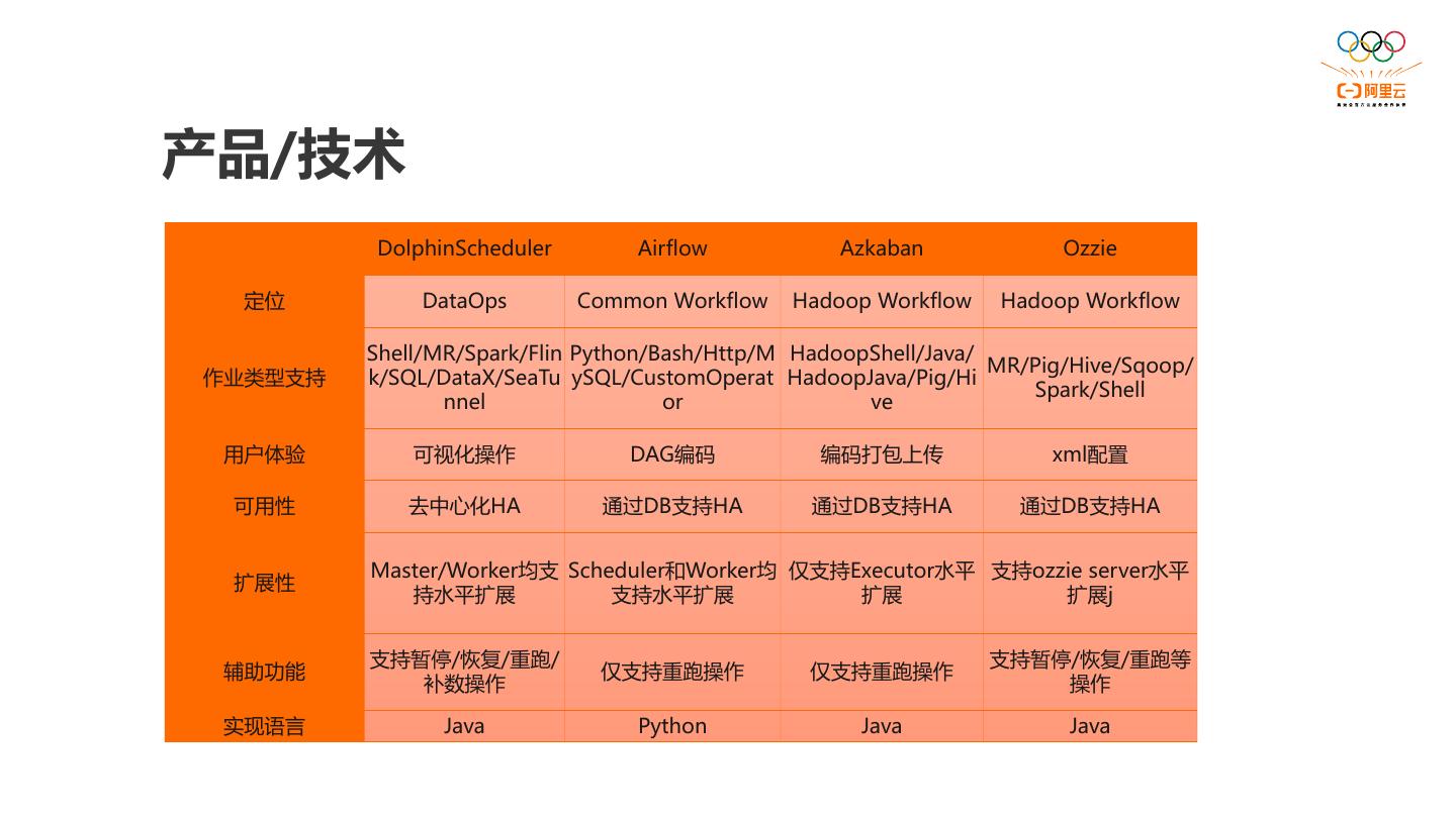 6 .产品/技术 DolphinScheduler Airflow Azkaban Ozzie 定位 DataOps Common Workflow Hadoop Workflow Hadoop Workflow Shell/MR/Spark/Flin Python/Bash/Http/M HadoopShell/Java/ MR/Pig/Hive/Sqoop/ 作业类型支持 k/SQL/DataX/SeaTu ySQL/CustomOperat HadoopJava/Pig/Hi Spark/Shell nnel or ve 用户体验 可视化操作 DAG编码 编码打包上传 xml配置 可用性 去中心化HA 通过DB支持HA 通过DB支持HA 通过DB支持HA Master/Worker均支 Scheduler和Worker均 仅支持Executor水平 支持ozzie server水平 扩展性 持水平扩展 支持水平扩展 扩展 扩展j 支持暂停/恢复/重跑/ 支持暂停/恢复/重跑等 辅助功能 仅支持重跑操作 仅支持重跑操作 补数操作 操作 实现语言 Java Python Java Java
