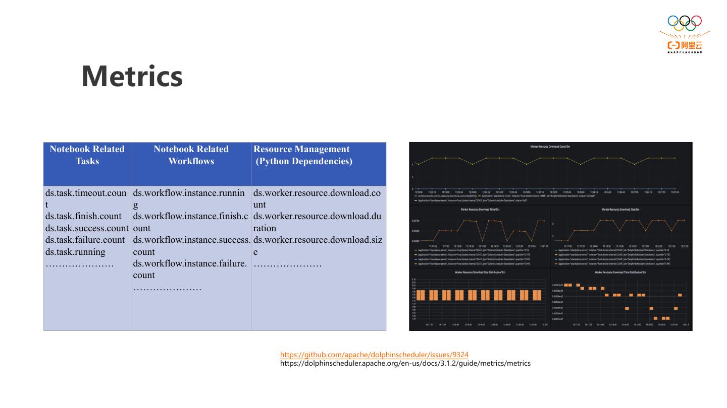 14 . Metrics Notebook Related Notebook Related Resource Management Tasks Workflows (Python Dependencies) ds.task.timeout.coun ds.workflow.instance.runnin ds.worker.resource.download.co t g unt ds.task.finish.count ds.workflow.instance.finish.c ds.worker.resource.download.du ds.task.success.count ount ration ds.task.failure.count ds.workflow.instance.success. ds.worker.resource.download.siz ds.task.running count e ………………… ds.workflow.instance.failure. ………………… count ………………… https://github.com/apache/dolphinscheduler/issues/9324 https://dolphinscheduler.apache.org/en-us/docs/3.1.2/guide/metrics/metrics