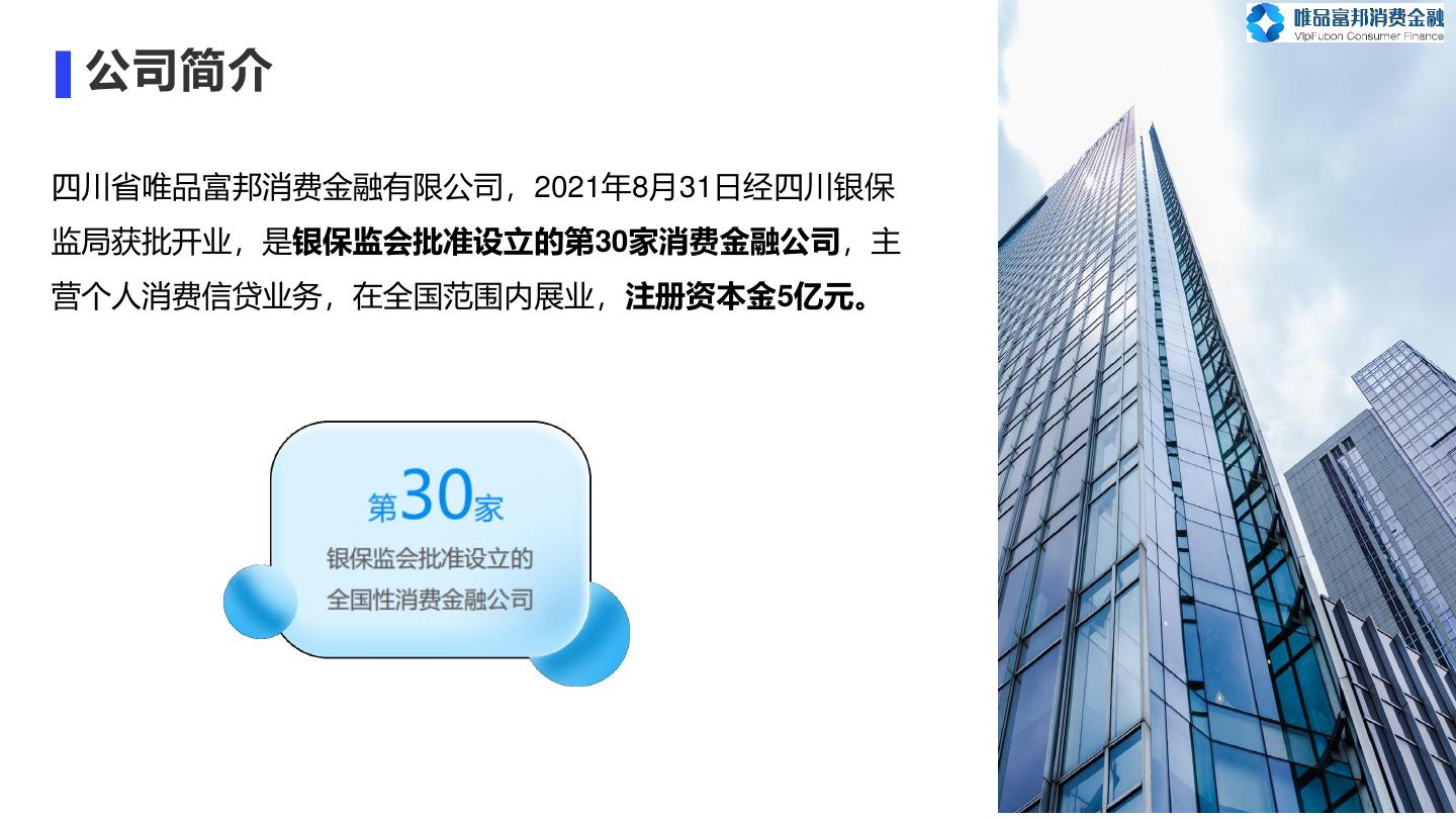 4 . 公司简介 四川省唯品富邦消费金融有限公司,2021年8月31日经四川银保 监局获批开业,是银保监会批准设立的第30家消费金融公司,主 营个人消费信贷业务,在全国范围内展业,注册资本金5亿元。