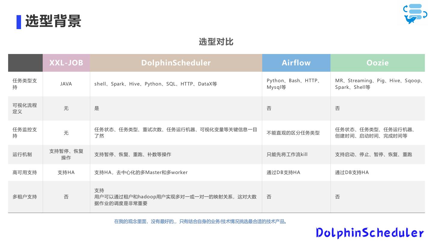 9 . 选型背景 选型对比 XXL-JOB DolphinScheduler Airflow Oozie 任务类型支 Python、Bash、HTTP、 MR、Streaming、Pig、Hive、Sqoop、 JAVA shell、Spark、Hive、Python、SQL、HTTP、DataX等 持 Mysql等 Spark、Shell等 可视化流程 无 是 否 否 定义 任务监控支 任务状态、任务类型、重试次数、任务运行机器、可视化变量等关键信息一目 任务状态、任务类型、任务运行机器、 无 不能直观的区分任务类型 持 了然 创建时间、启动时间、完成时间等 支持暂停、恢复 运行机制 支持暂停、恢复、重跑、补数等操作 只能先将工作流kill 支持启动、停止、暂停、恢复、重跑 操作 高可用支持 支持HA 支持HA,去中心化的多Master和多worker 通过DB支持HA 通过DB支持HA 支持 多租户支持 否 用户可以通过租户和hadoop用户实现多对一或一对一的映射关系,这对大数 否 否 据作业的调度是非常重要 在我的观念里面,没有最好的,,只有结合自身的业务/技术情况挑选最合适的技术产品。