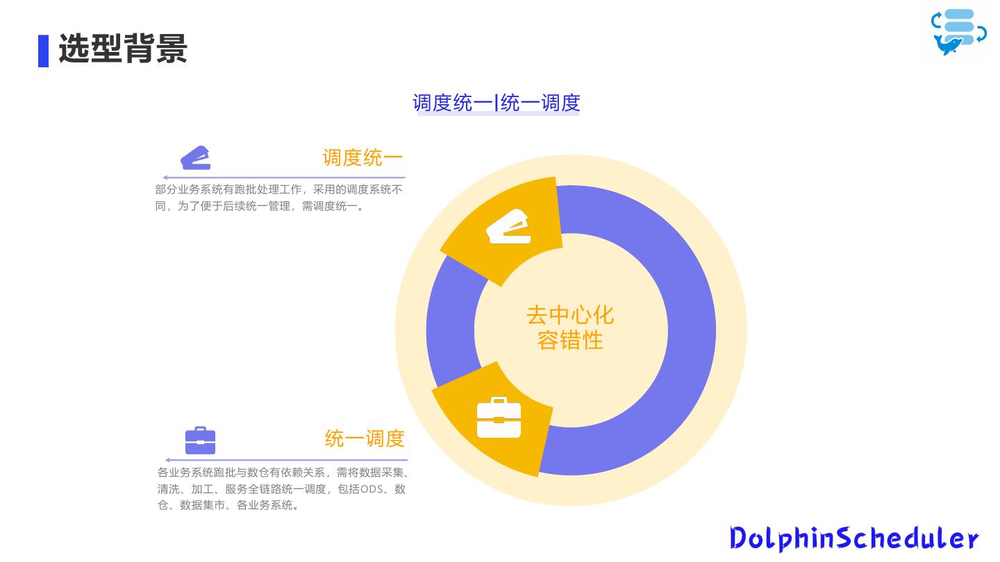 10 .选型背景 调度统一|统一调度 调度统一 部分业务系统有跑批处理工作,采用的调度系统不 同,为了便于后续统一管理,需调度统一。 去中心化 容错性 统一调度 各业务系统跑批与数仓有依赖关系,需将数据采集、 清洗、加工、服务全链路统一调度,包括ODS、数 仓、数据集市、各业务系统。