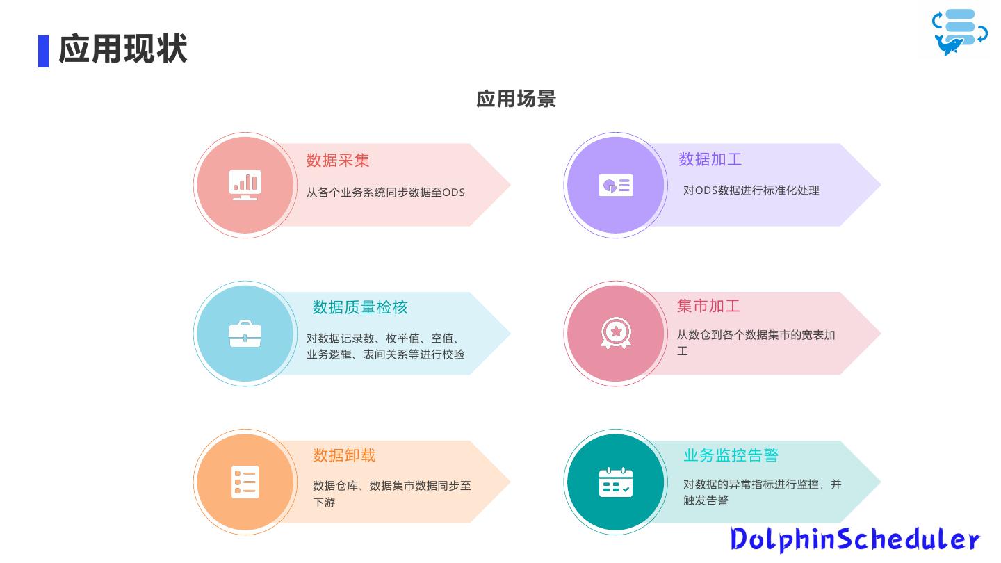 13 .应用现状 应用场景 数据加工 从各个业务系统同步数据至ODS 对ODS数据进行标准化处理 数据质量检核 集市加工 对数据记录数、枚举值、空值、 从数仓到各个数据集市的宽表加 业务逻辑、表间关系等进行校验 工 数据卸载 业务监控告警 数据仓库、数据集市数据同步至 对数据的异常指标进行监控,并 下游 触发告警