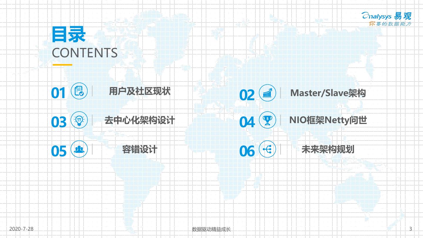 3 . 目录 CONTENTS 01 用户及社区现状 02 Master/Slave架构 03 去中心化架构设计 04 NIO框架Netty问世 05 容错设计 06 未来架构规划 2020-7-28 数据驱动精益成长 3