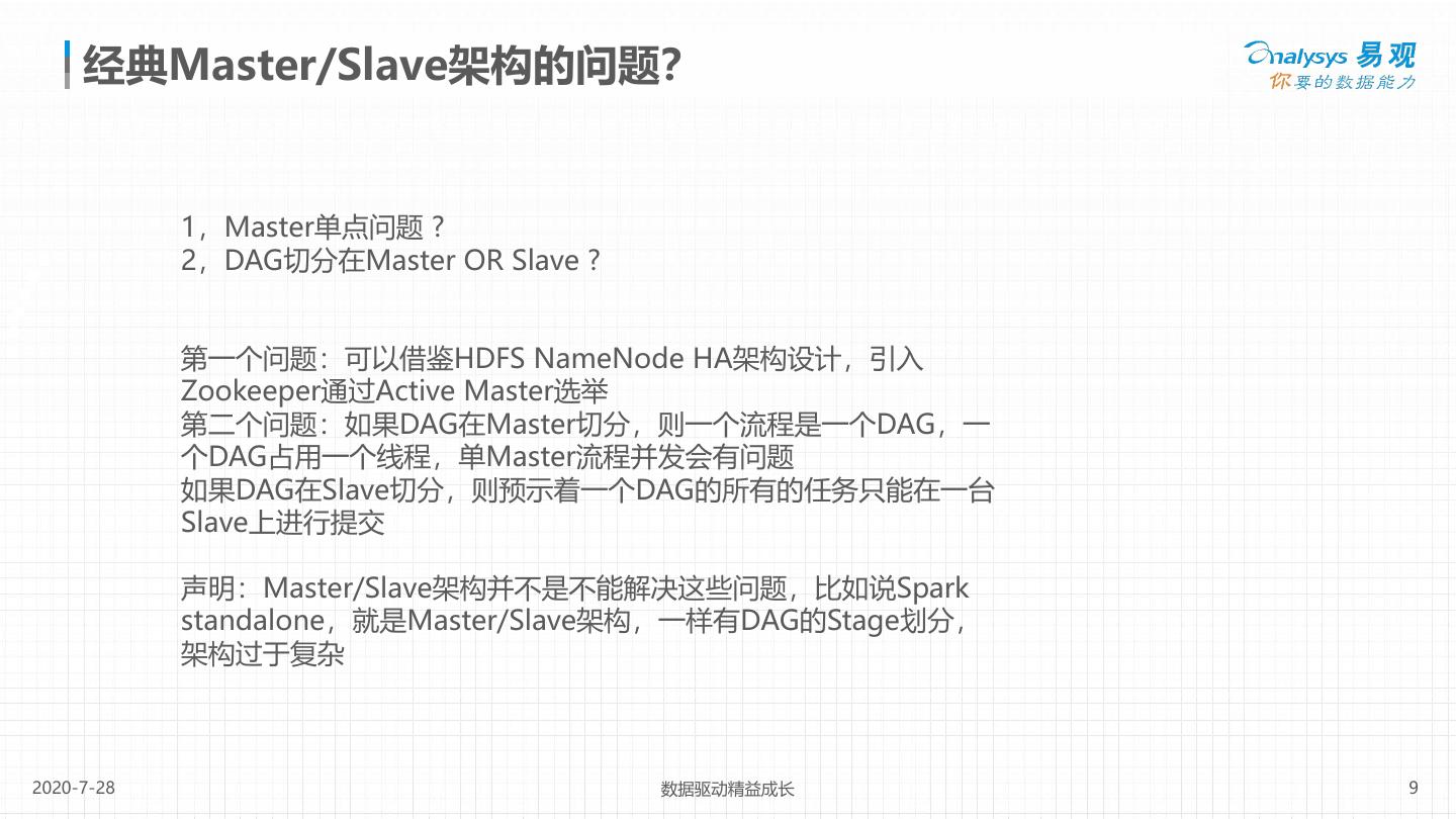 9 . 经典Master/Slave架构的问题? 1,Master单点问题 ? 2,DAG切分在Master OR Slave ? 第一个问题:可以借鉴HDFS NameNode HA架构设计,引入 Zookeeper通过Active Master选举 第二个问题:如果DAG在Master切分,则一个流程是一个DAG,一 个DAG占用一个线程,单Master流程并发会有问题 如果DAG在Slave切分,则预示着一个DAG的所有的任务只能在一台 Slave上进行提交 声明:Master/Slave架构并不是不能解决这些问题,比如说Spark standalone,就是Master/Slave架构,一样有DAG的Stage划分, 架构过于复杂 2020-7-28 数据驱动精益成长 9