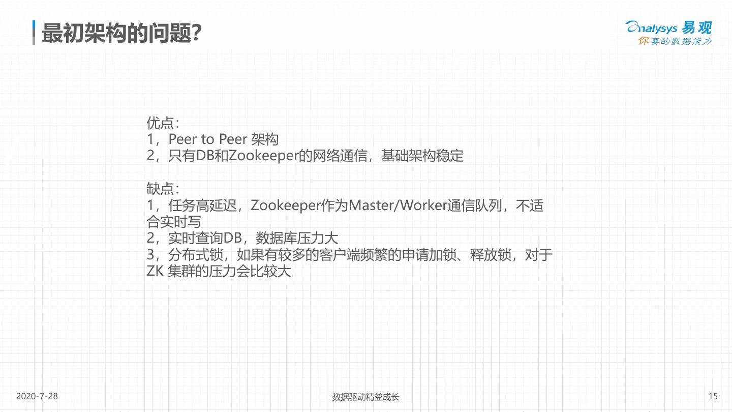 15 . 最初架构的问题? 优点: 1,Peer to Peer 架构 2,只有DB和Zookeeper的网络通信,基础架构稳定 缺点: 1,任务高延迟,Zookeeper作为Master/Worker通信队列,不适 合实时写 2,实时查询DB,数据库压力大 3,分布式锁,如果有较多的客户端频繁的申请加锁、释放锁,对于 ZK 集群的压力会比较大 2020-7-28 数据驱动精益成长 15
