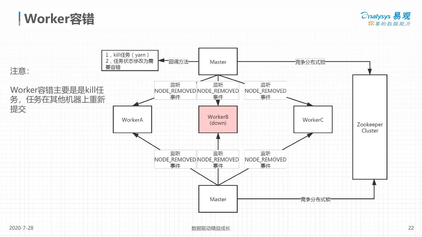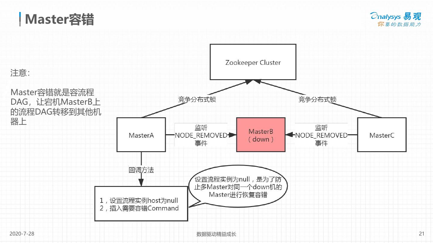 21 . Master容错 注意: Master容错就是容流程 DAG,让宕机MasterB上 的流程DAG转移到其他机 器上 2020-7-28 数据驱动精益成长 21