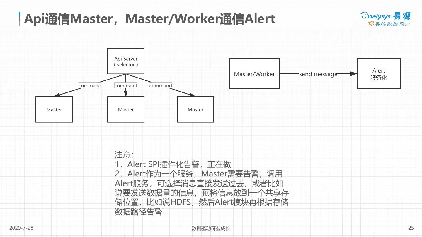 25 . Api通信Master,Master/Worker通信Alert 注意: 1,Alert SPI插件化告警,正在做 2,Alert作为一个服务,Master需要告警,调用 Alert服务,可选择消息直接发送过去,或者比如 说要发送数据量的信息,预将信息放到一个共享存 储位置,比如说HDFS,然后Alert模块再根据存储 数据路径告警 2020-7-28 数据驱动精益成长 25