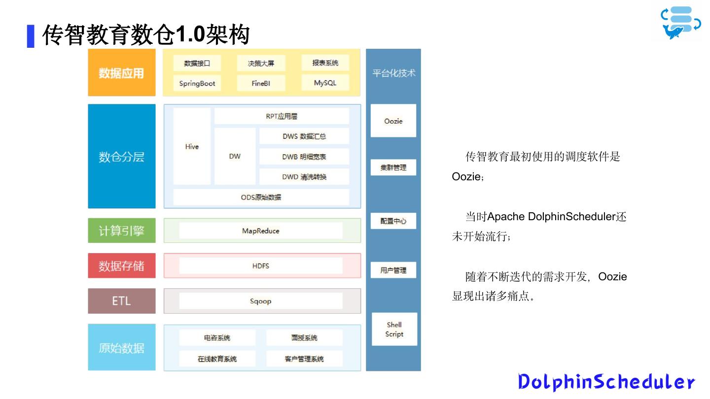 4 .传智教育数仓1.0架构 传智教育最初使用的调度软件是 Oozie; 当时Apache DolphinScheduler还 未开始流行; 随着不断迭代的需求开发,Oozie 显现出诸多痛点。