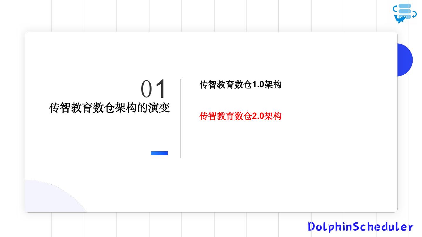 2 .目录 CONTENTS 01 02 传智教育 DolphinScheduler 数仓架构的演变 在传智的实践与思考 03 Hive&SparkSQL调度 展望未来