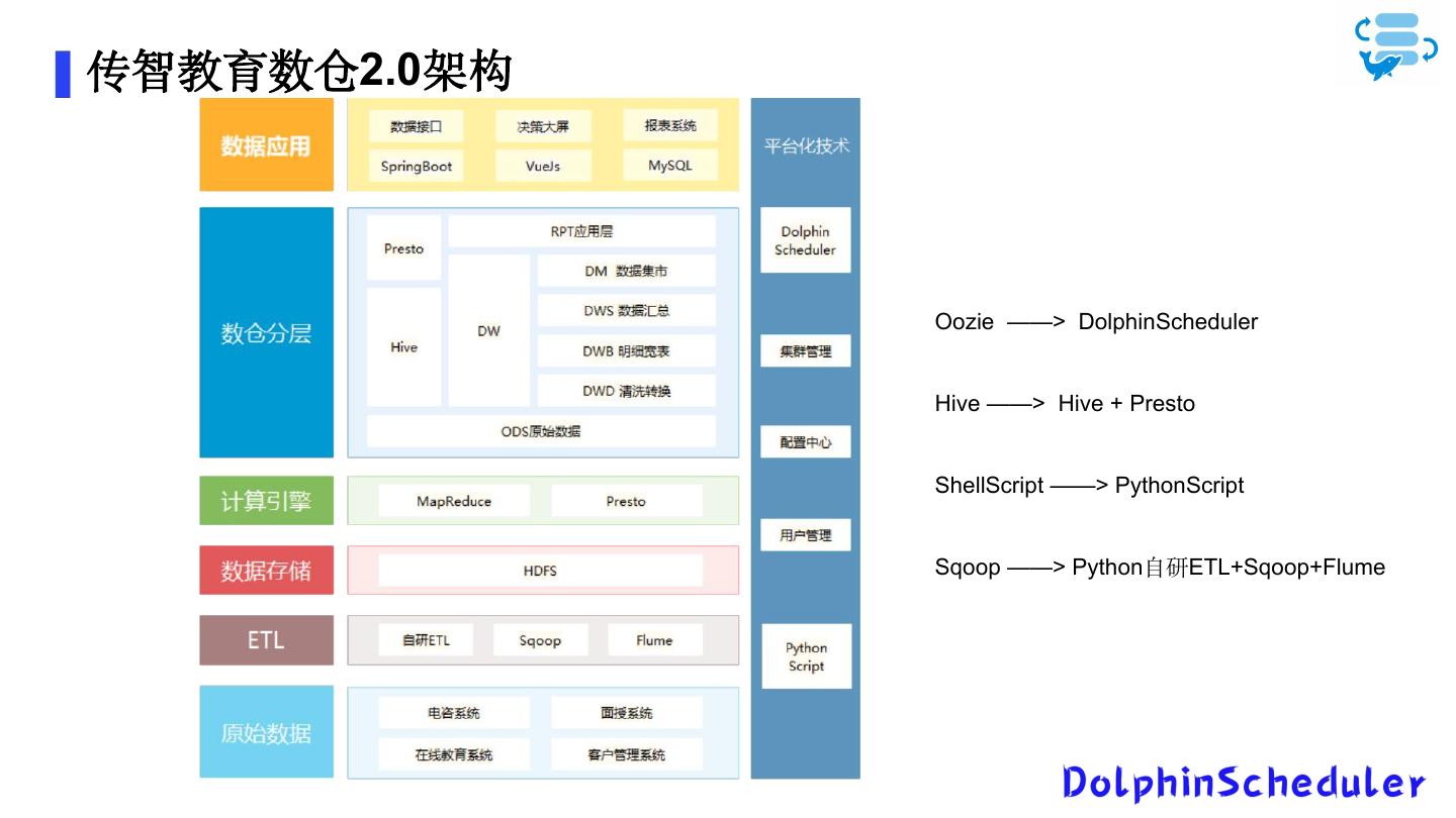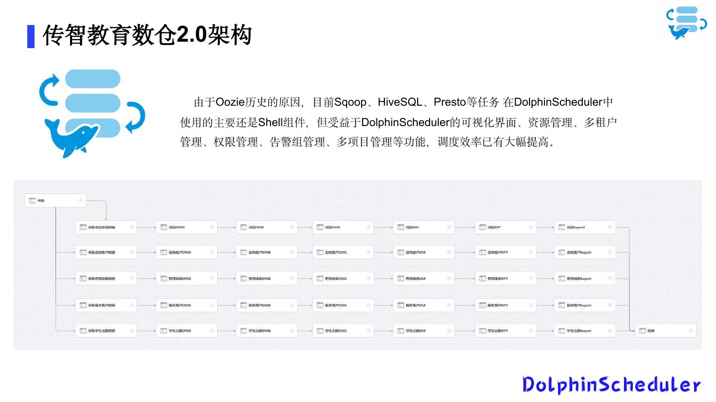 8 .传智教育数仓2.0架构 由于Oozie历史的原因,目前Sqoop、HiveSQL、Presto等任务 在DolphinScheduler中 使用的主要还是Shell组件,但受益于DolphinScheduler的可视化界面、资源管理、多租户 管理、权限管理、告警组管理、多项目管理等功能,调度效率已有大幅提高。
