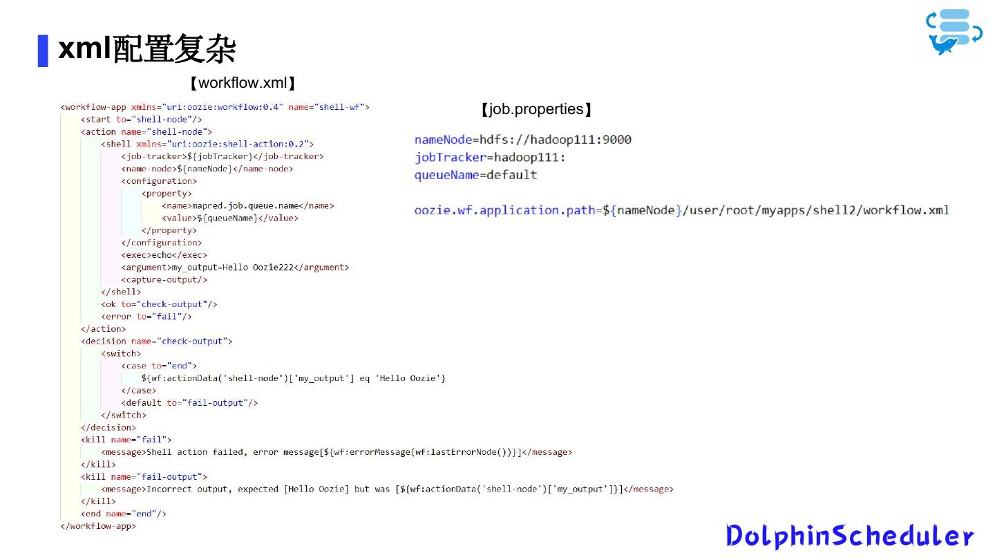 13 .xml配置复杂 传智教育以前采用的工作流调度软件是Oozie: Oozie是一个工作流引擎,默认采用HPDL语言(XML)定义流程,可视化支持依赖于第三方工具软件 (比如HUE),自带的可视化界面功能较弱。 Oozie工作流的核心组成:job.properites 和 workflow.xml。 设定常用参数变量 定义具体工作流