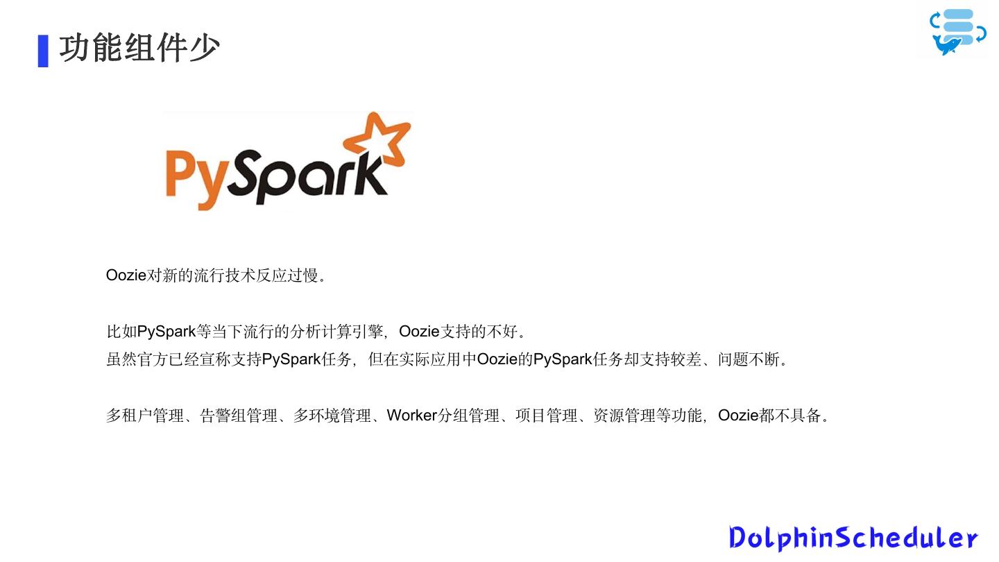 15 .功能组件少 Oozie对新的流行技术反应过慢。 比如PySpark等当下流行的分析计算引擎,Oozie支持的不好。 虽然官方已经宣称支持PySpark任务,但在实际应用中Oozie的PySpark任务却支持较差、问题不断。 多租户管理、告警组管理、多环境管理、Worker分组管理、项目管理、资源管理等功能,Oozie都不具备。