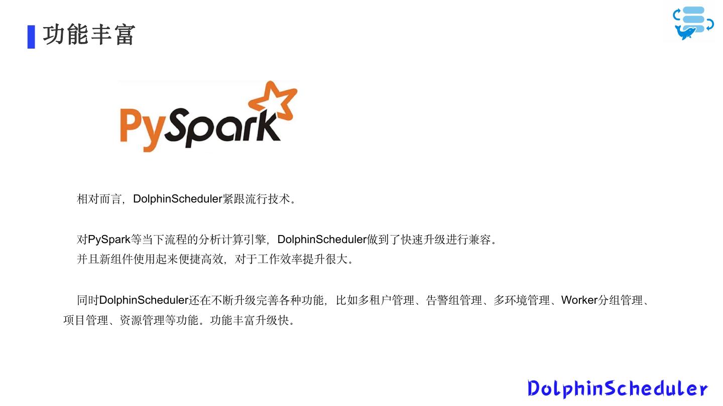 20 .功能丰富 相对而言,DolphinScheduler紧跟流行技术。 对PySpark等当下流程的分析计算引擎,DolphinScheduler做到了快速升级进行兼容。 并且新组件使用起来便捷高效,对于工作效率提升很大。 同时DolphinScheduler还在不断升级完善各种功能,比如多租户管理、告警组管理、多环境管理、Worker分组管理、 项目管理、资源管理等功能。功能丰富升级快。