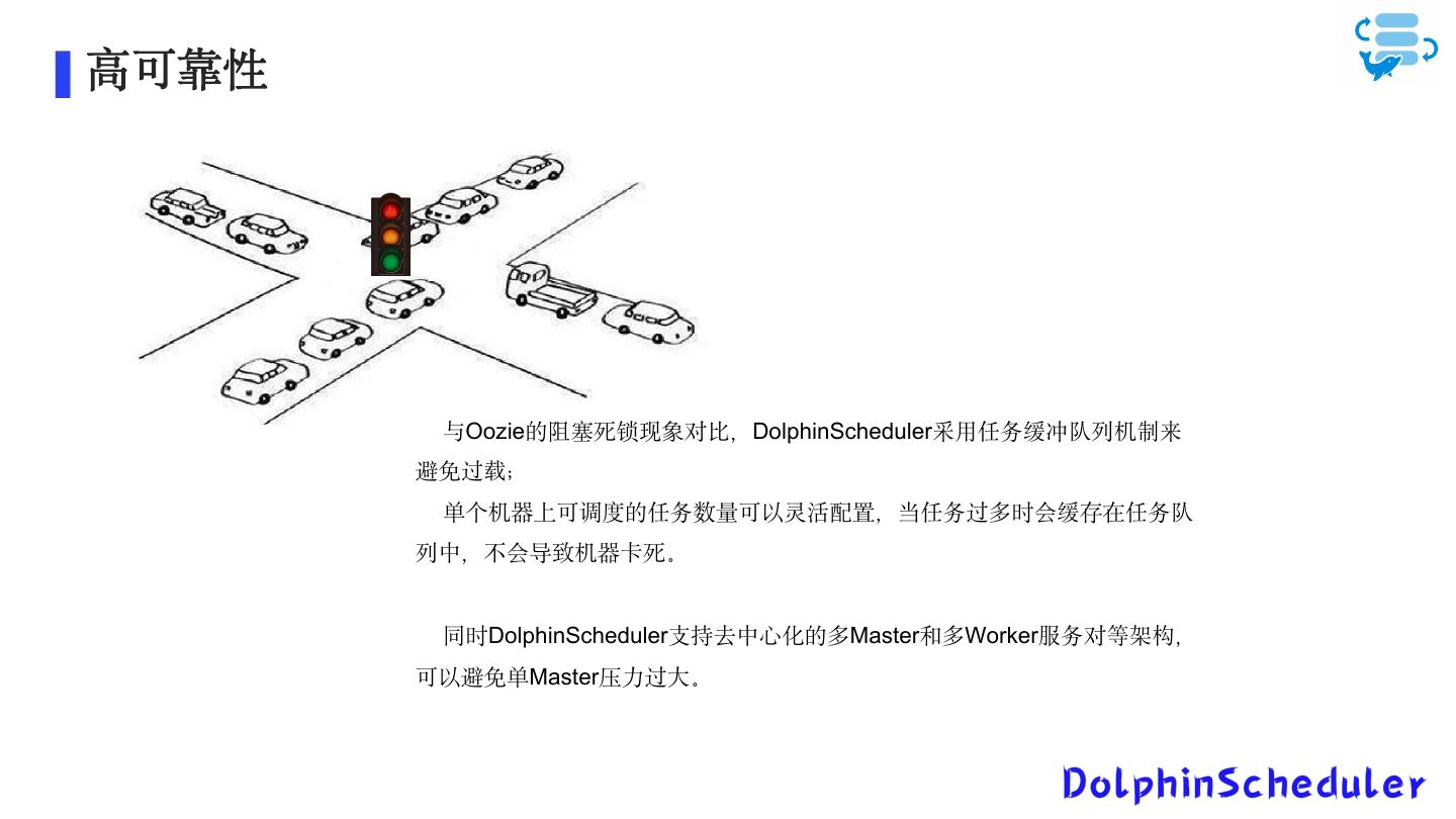 21 .高可靠性 与Oozie的阻塞死锁现象对比,DolphinScheduler采用任务缓冲队列机制来 避免过载; 单个机器上可调度的任务数量可以灵活配置,当任务过多时会缓存在任务队 列中,不会导致机器卡死。 同时DolphinScheduler支持去中心化的多Master和多Worker服务对等架构, 可以避免单Master压力过大。