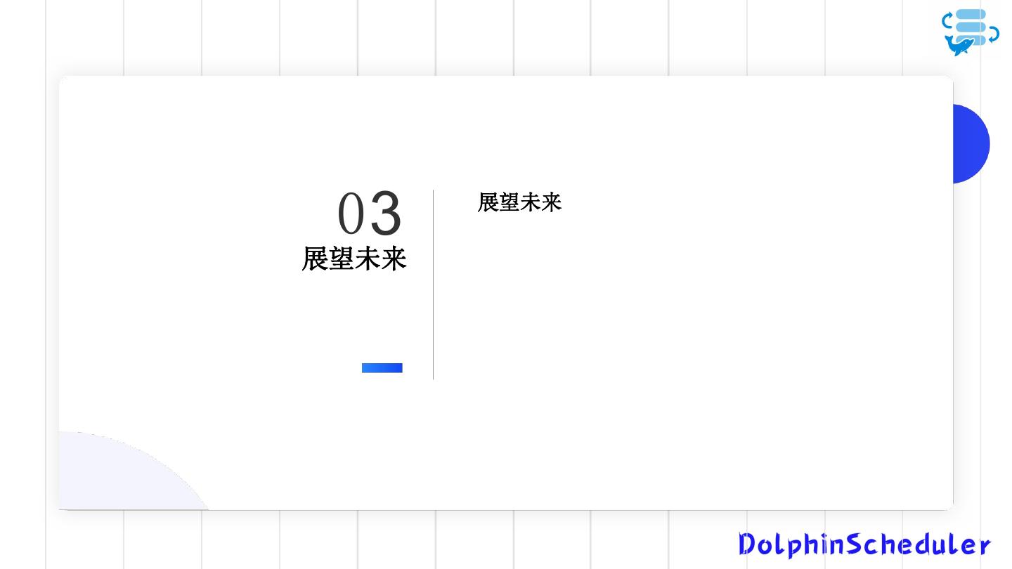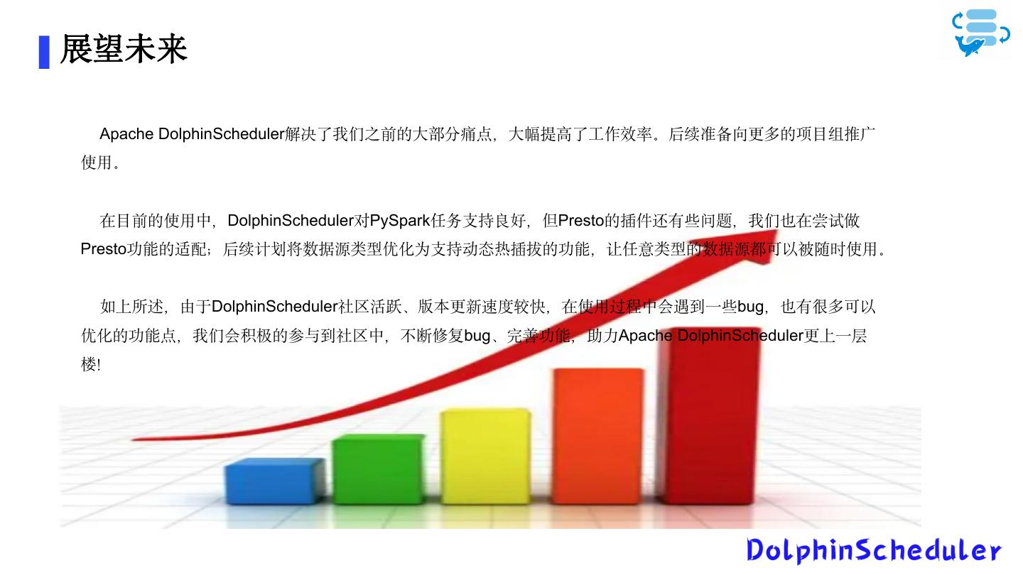 24 .展望未来 Apache DolphinScheduler解决了我们之前的大部分痛点,大幅提高了工作效率。后续准备向更多的项目组推广 使用。 在目前的使用中,DolphinScheduler对PySpark任务支持良好,但Presto的插件还有些问题,我们也在尝试做 Presto功能的适配;后续计划将数据源类型优化为支持动态热插拔的功能,让任意类型的数据源都可以被随时使用。 如上所述,由于DolphinScheduler社区活跃、版本更新速度较快,在使用过程中会遇到一些bug,也有很多可以 优化的功能点,我们会积极的参与到社区中,不断修复bug、完善功能,助力Apache DolphinScheduler更上一层 楼!