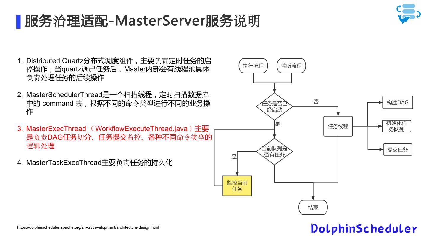 13 . 服务治理适配-MasterServer服务说明 1. Distributed Quartz分布式调度组件,主要负责定时任务的启 停操作,当quartz调起任务后,Master内部会有线程池具体 负责处理任务的后续操作 2. MasterSchedulerThread是一个扫描线程,定时扫描数据库 中的 command 表,根据不同的命令类型进行不同的业务操 作 3. MasterExecThread (WorkflowExecuteThread.java)主要 是负责DAG任务切分、任务提交监控、各种不同命令类型的 逻辑处理 4. MasterTaskExecThread主要负责任务的持久化 https://dolphinscheduler.apache.org/zh-cn/development/architecture-design.html