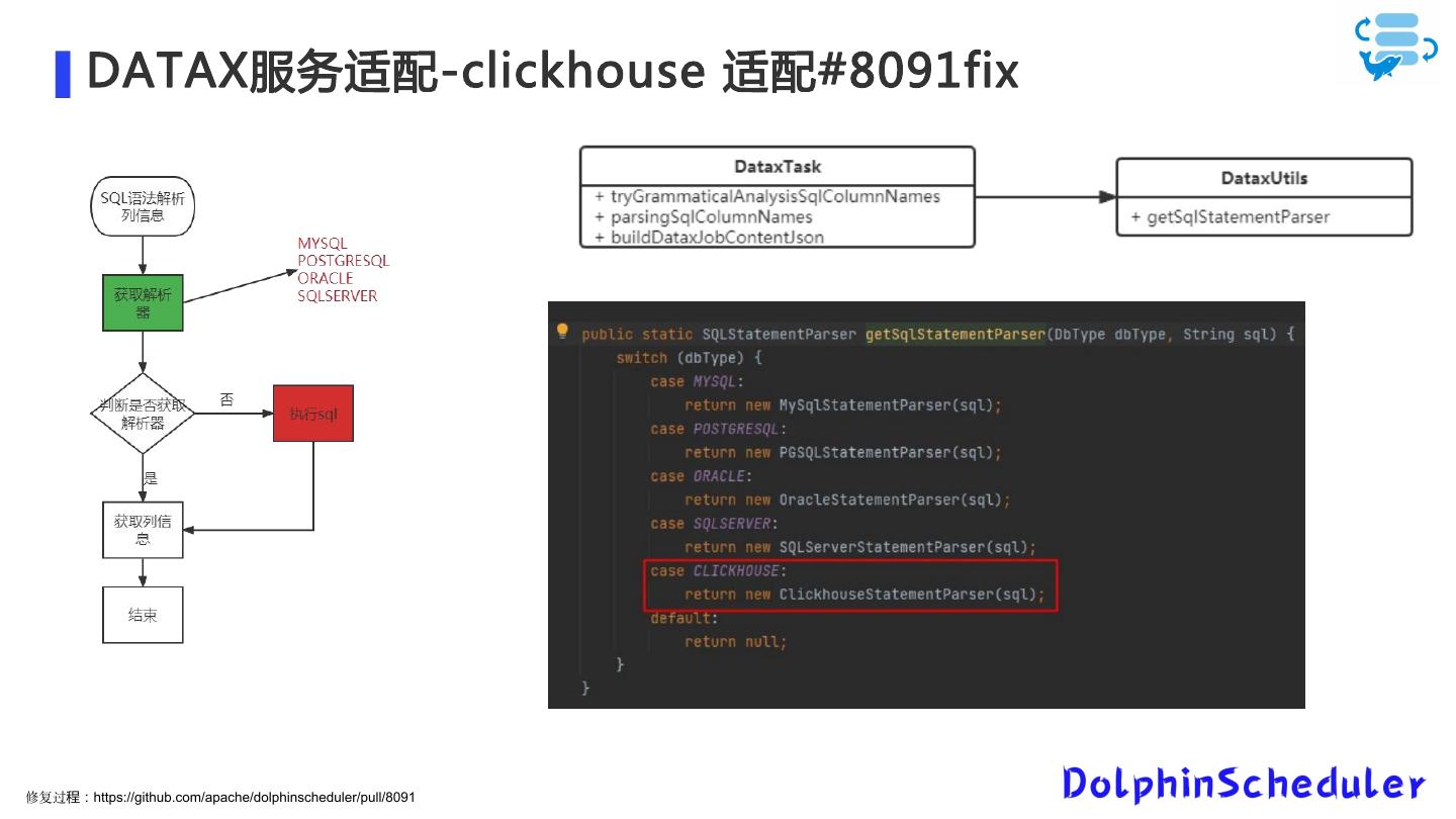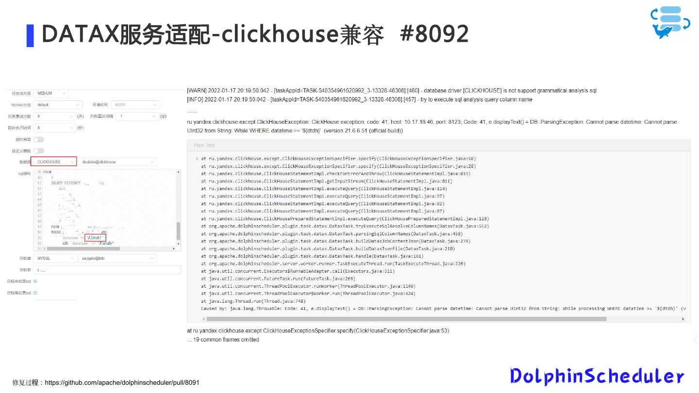 17 . DATAX服务适配-clickhouse兼容 #8092 修复过程:https://github.com/apache/dolphinscheduler/pull/8091