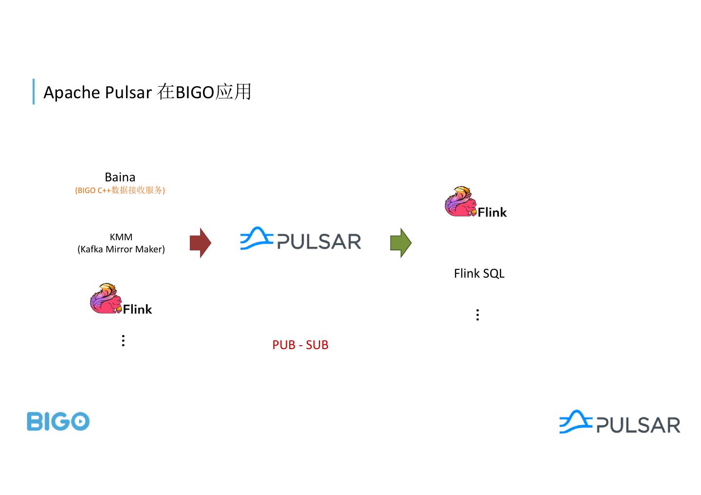 8 .Apache Pulsar BIGO Baina (BIGO C++ ) KMM (Kafka Mirror Maker) Flink SQL … … PUB - SUB