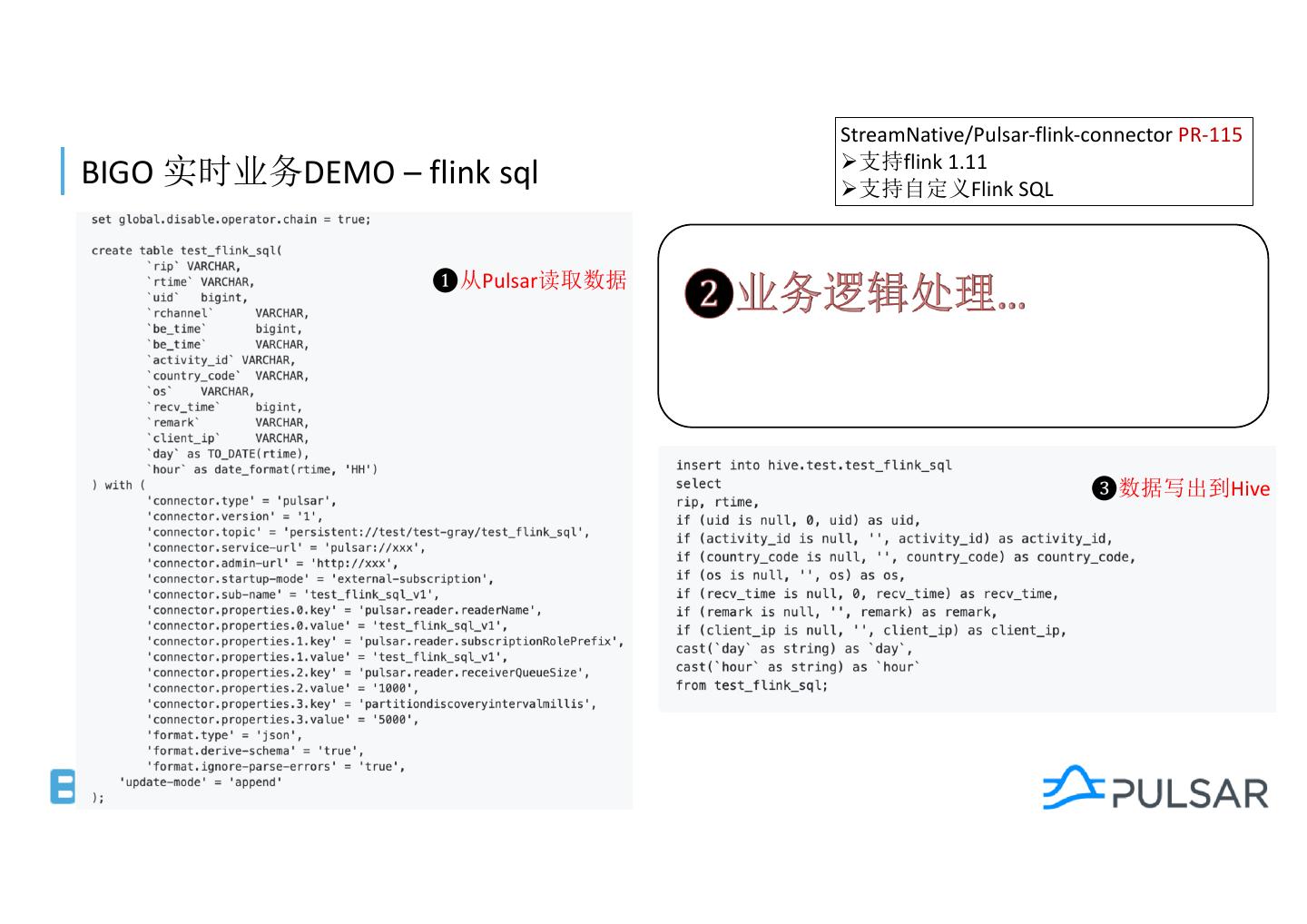 10 . StreamNative/Pulsar-flink-connector PR-115 Ø flink 1.11 BIGO DEMO – flink sql Ø Flink SQL ❶ Pulsar ❸ Hive
