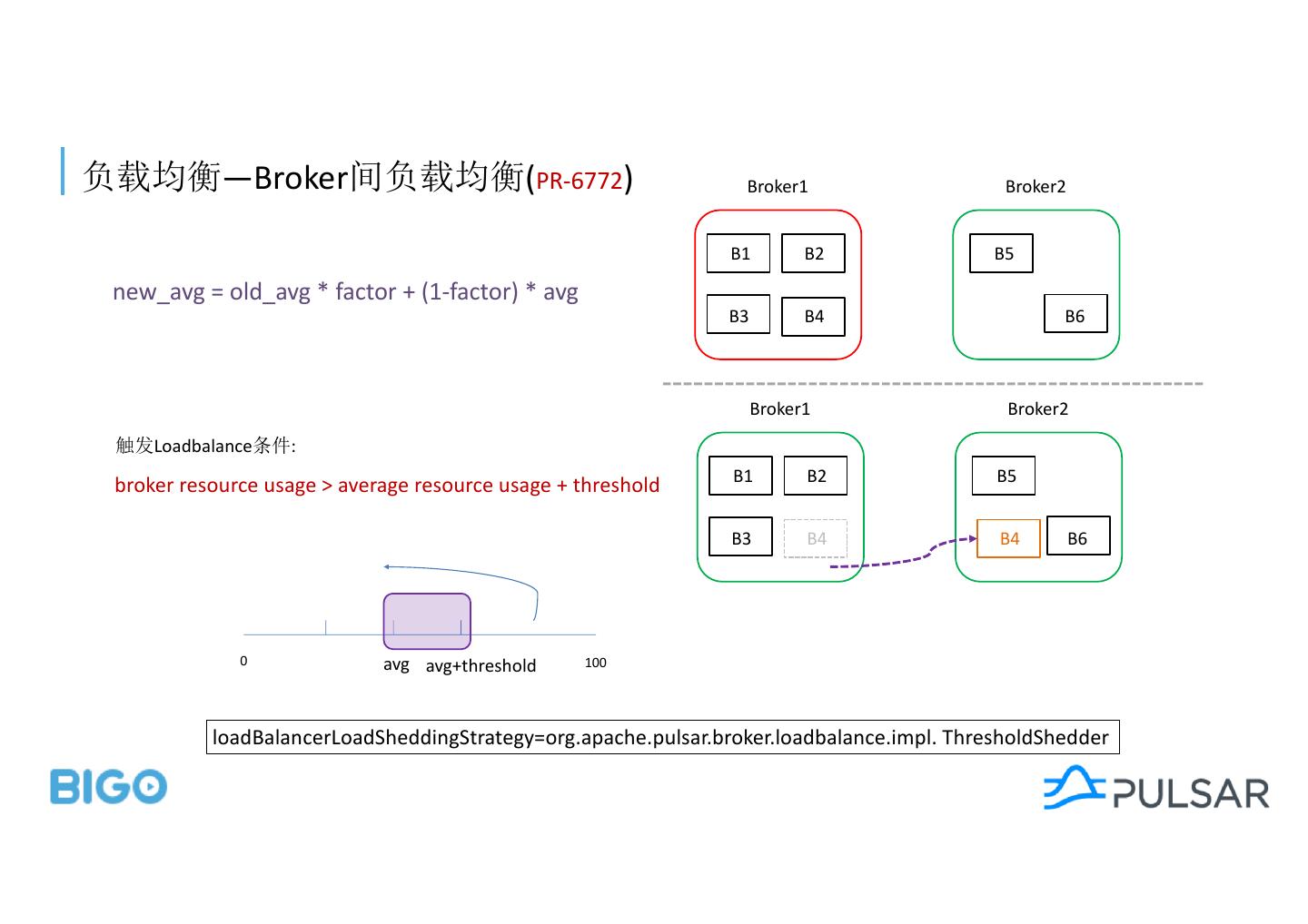 19 . —Broker (PR-6772) Broker1 Broker2 B1 B2 B5 new_avg = old_avg * factor + (1-factor) * avg B3 B4 B6 Broker1 Broker2 Loadbalance : B1 B2 B5 broker resource usage > average resource usage + threshold B3 B4 B4 B6 0 avg avg+threshold 100 loadBalancerLoadSheddingStrategy=org.apache.pulsar.broker.loadbalance.impl. ThresholdShedder