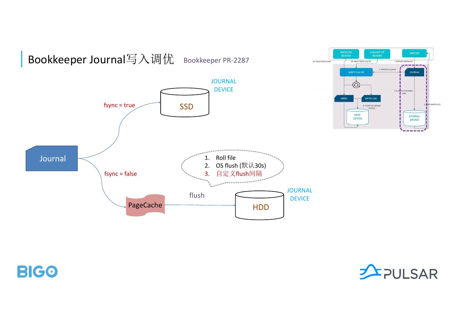 29 .Bookkeeper Journal Bookkeeper PR-2287 JOURNAL DEVICE fsync = true SSD Journal 1. Roll file 2. OS flush ( 30s) fsync = false 3. flush JOURNAL flush DEVICE PageCache HDD