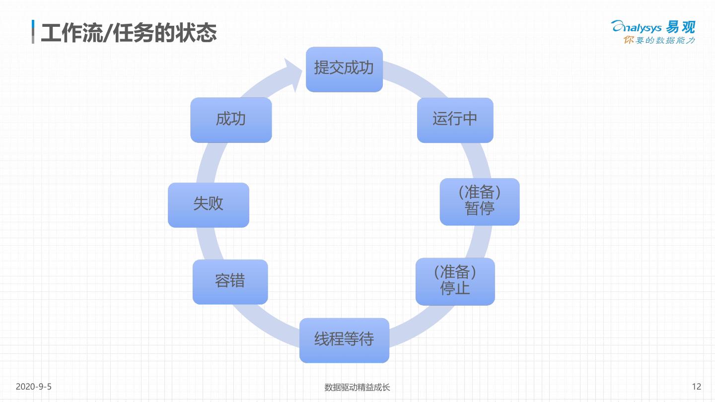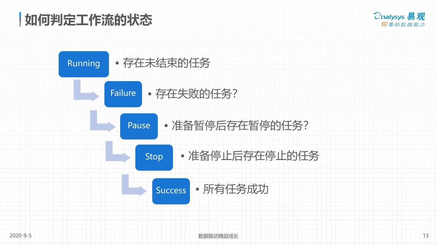 12 . 工作流/任务的状态 提交成功 成功 运行中 (准备) 失败 暂停 (准备) 容错 停止 线程等待 2020-9-5 数据驱动精益成长 12
