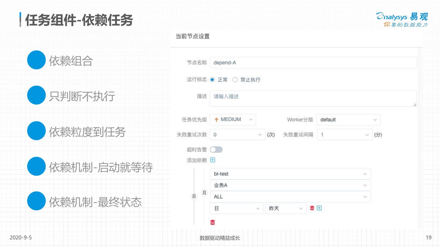 19 . 任务组件-依赖任务 依赖组合 只判断不执行 依赖粒度到任务 依赖机制-启动就等待 依赖机制-最终状态 2020-9-5 数据驱动精益成长 19